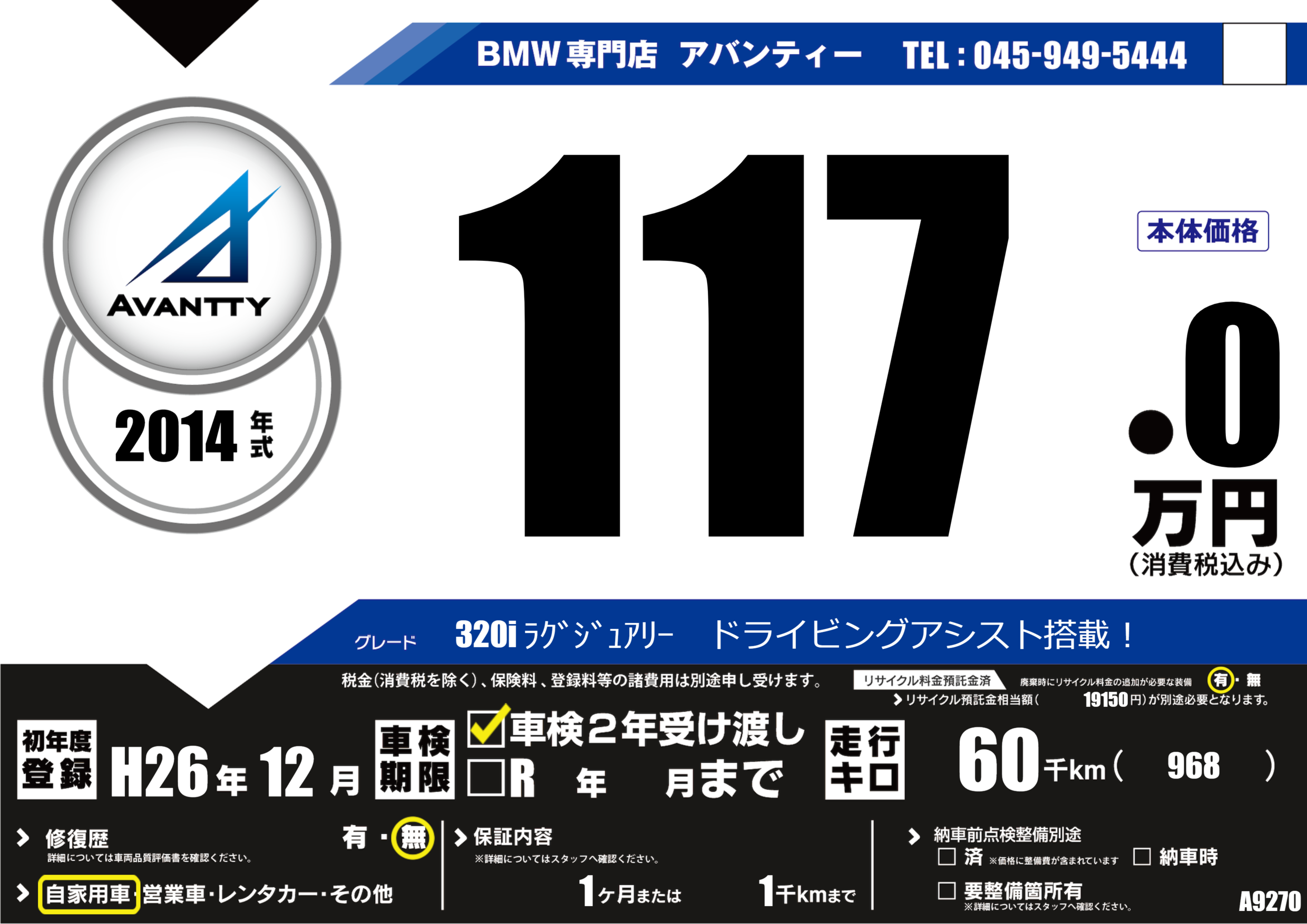 | 走行キロ | 6万km | 初年度登録 | H26年12月 |