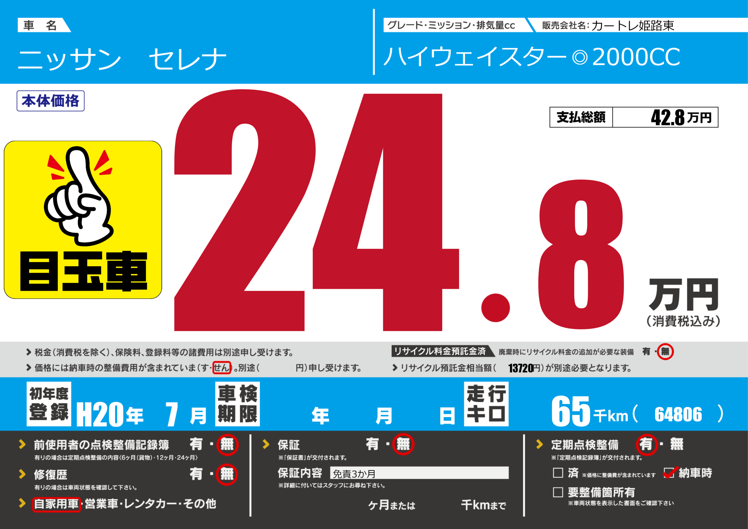 | 走行キロ | 6.5万km | 初年度登録 | H20年7月 |