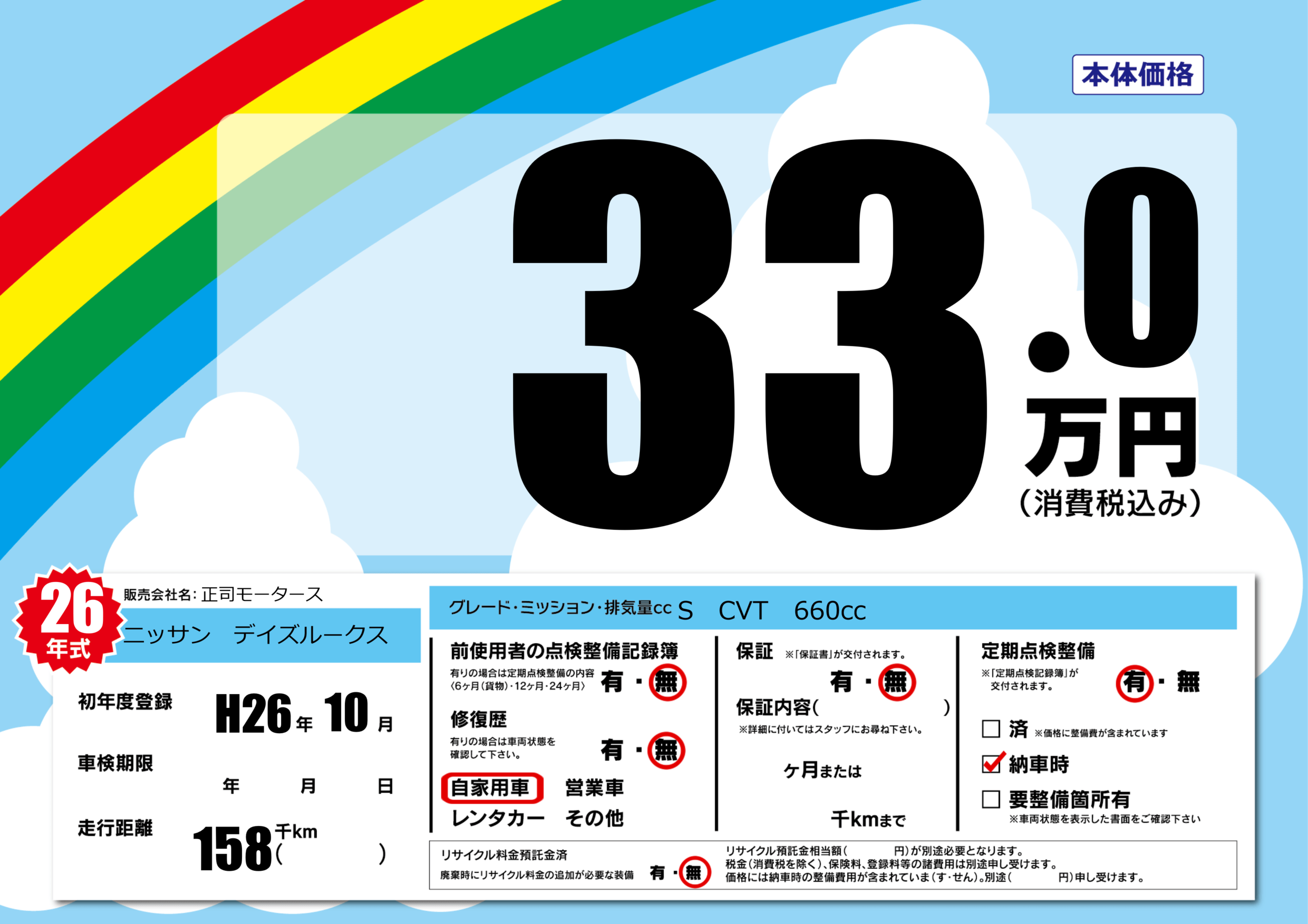 | 定期点検整備 | 定期点検整備あり 納車時あり | ||