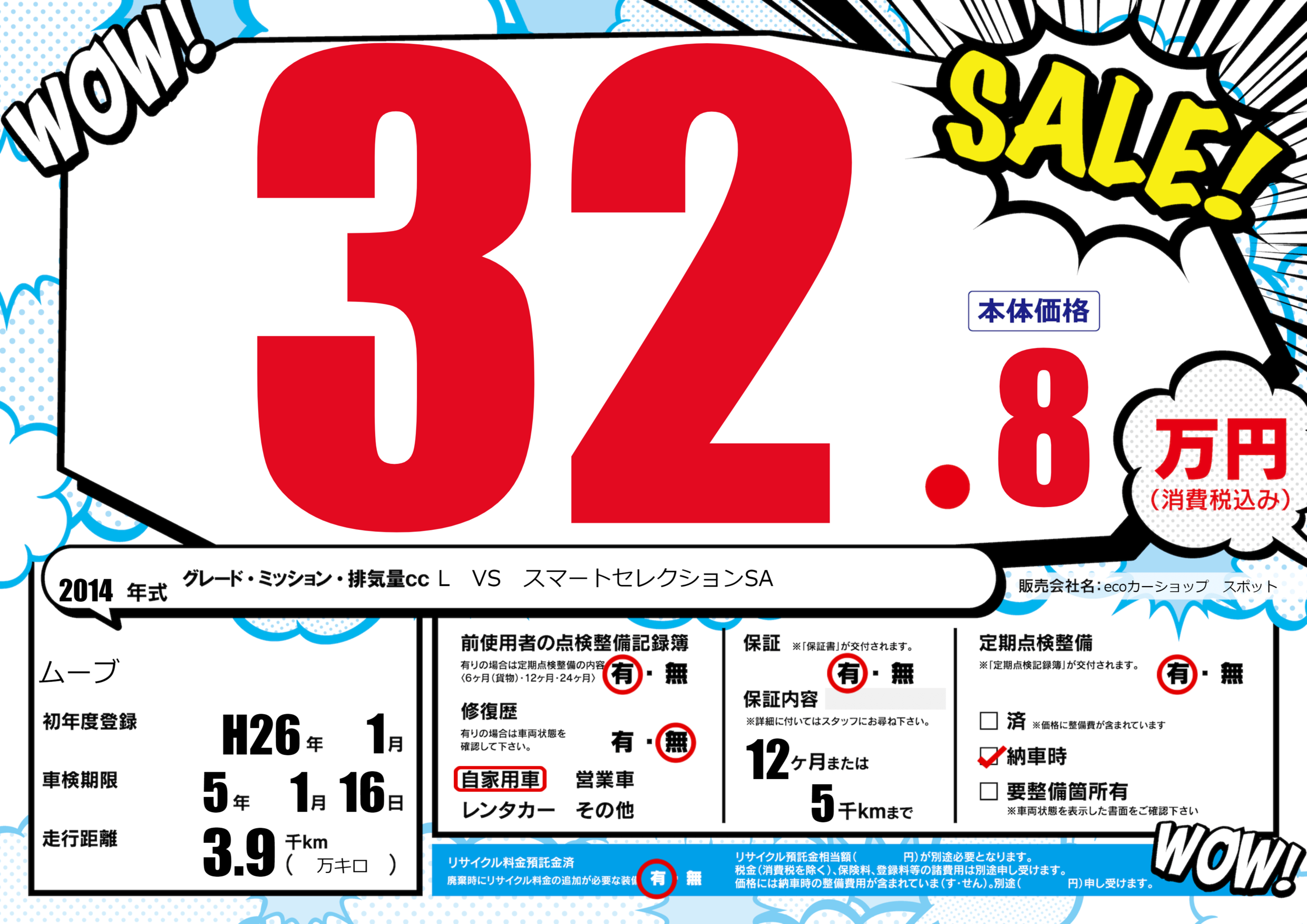 | 走行キロ | 0.3万km | 初年度登録 | H26年1月 |