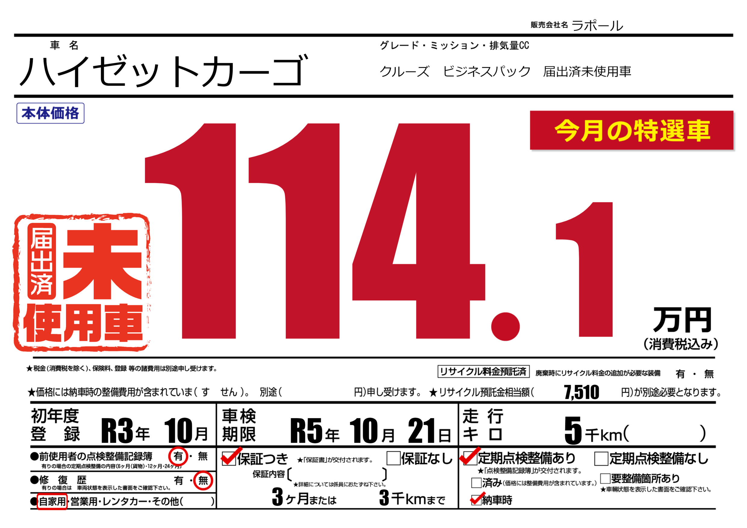 | 車名 | ハイゼットカーゴ | グレード ミッション 排気量 |