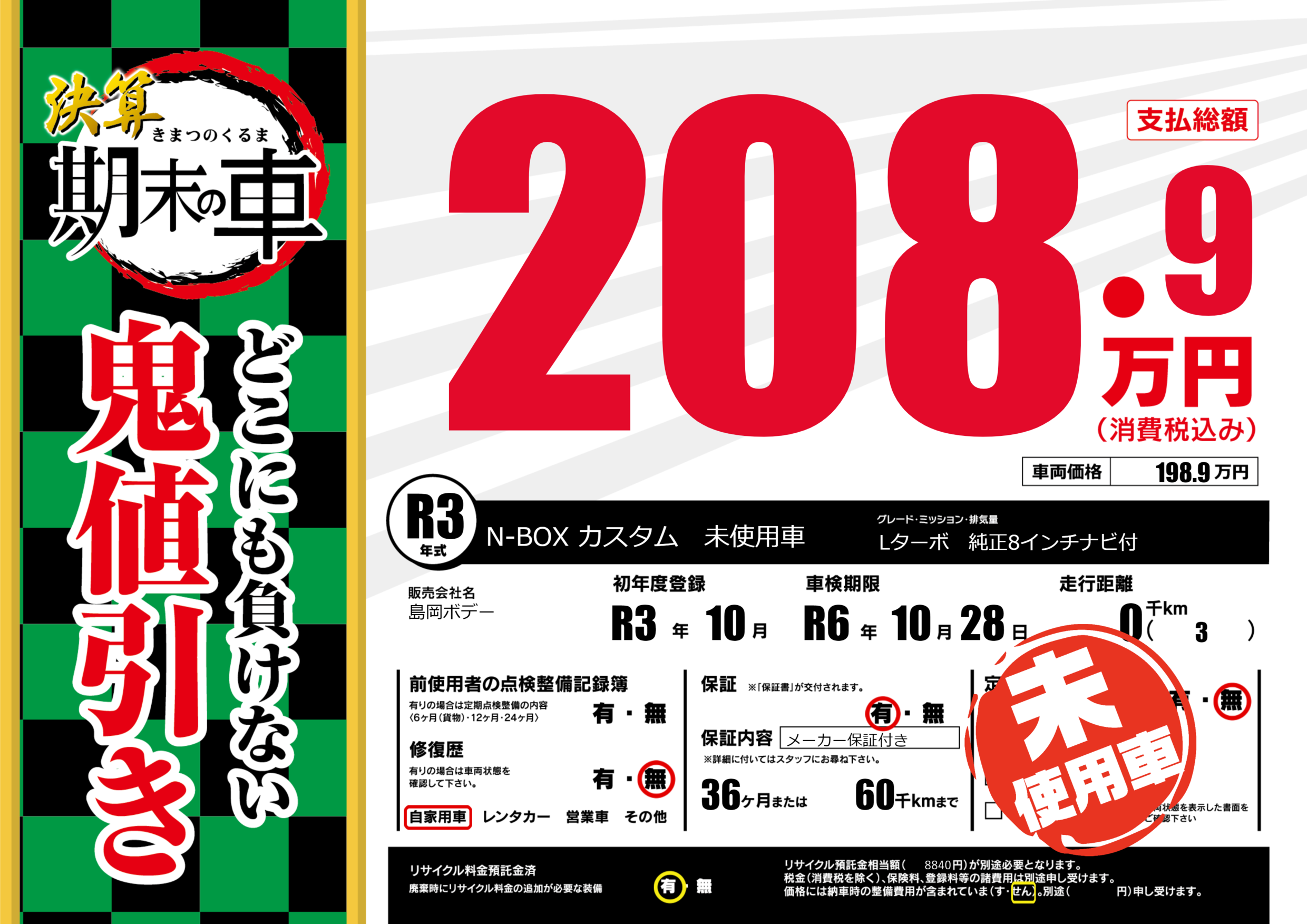 | 車名 | N-BOX カスタム 未使用車 | グレード ミッション 排気量 |