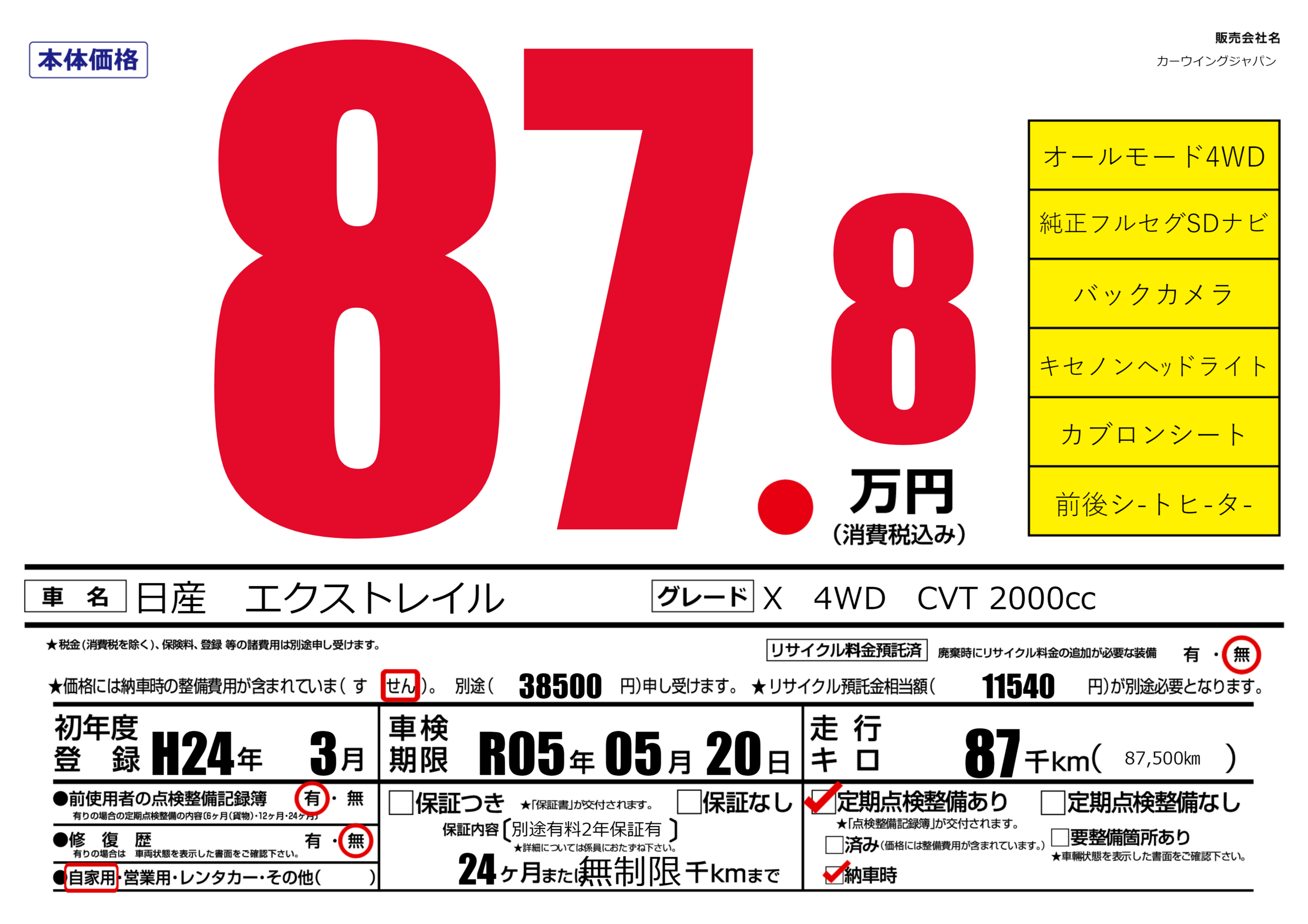 | 車名 | 日産 エクストレイル | グレード ミッション 排気量 |