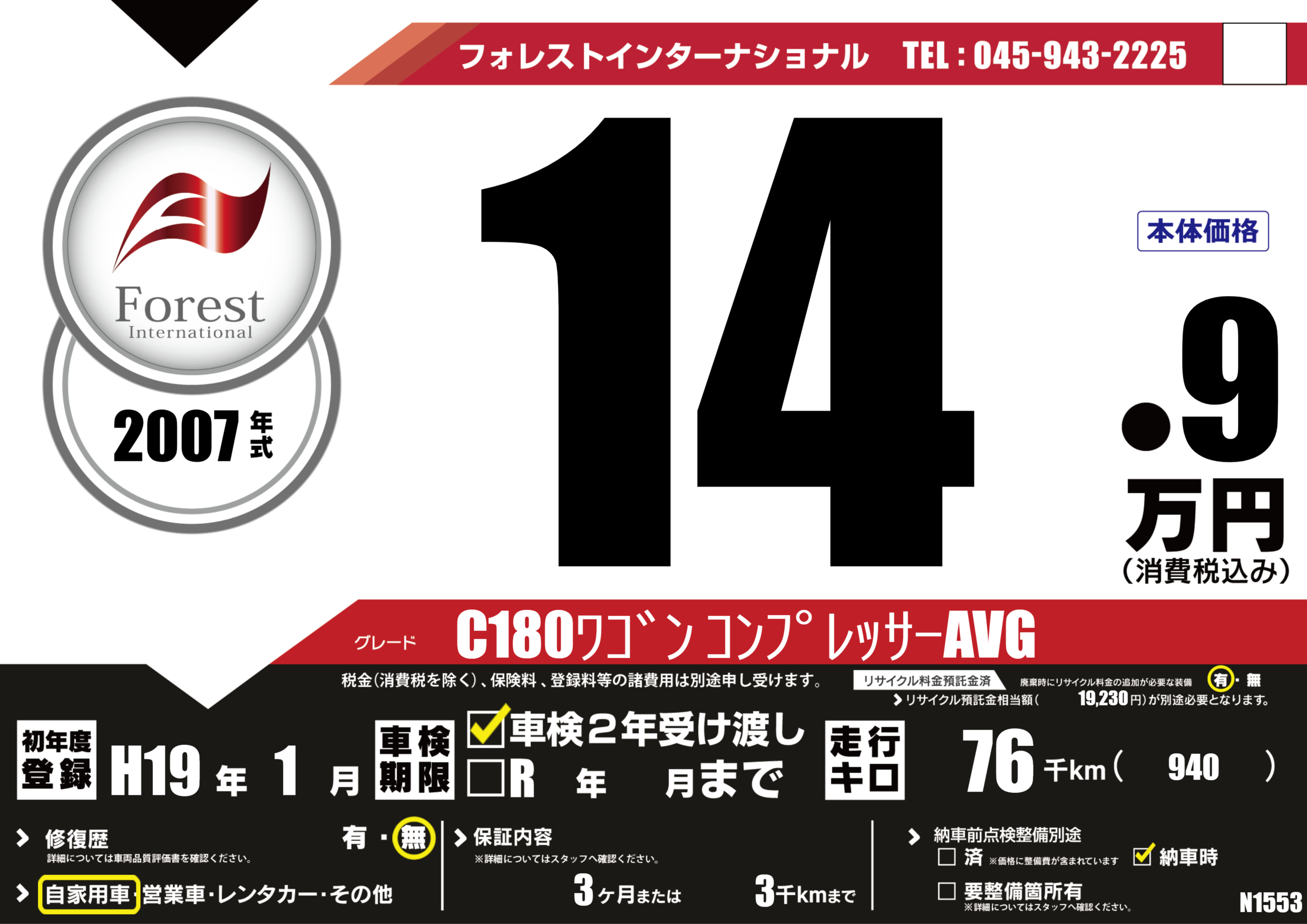 | 走行キロ | 7.6万km | 初年度登録 | H19年1月 |