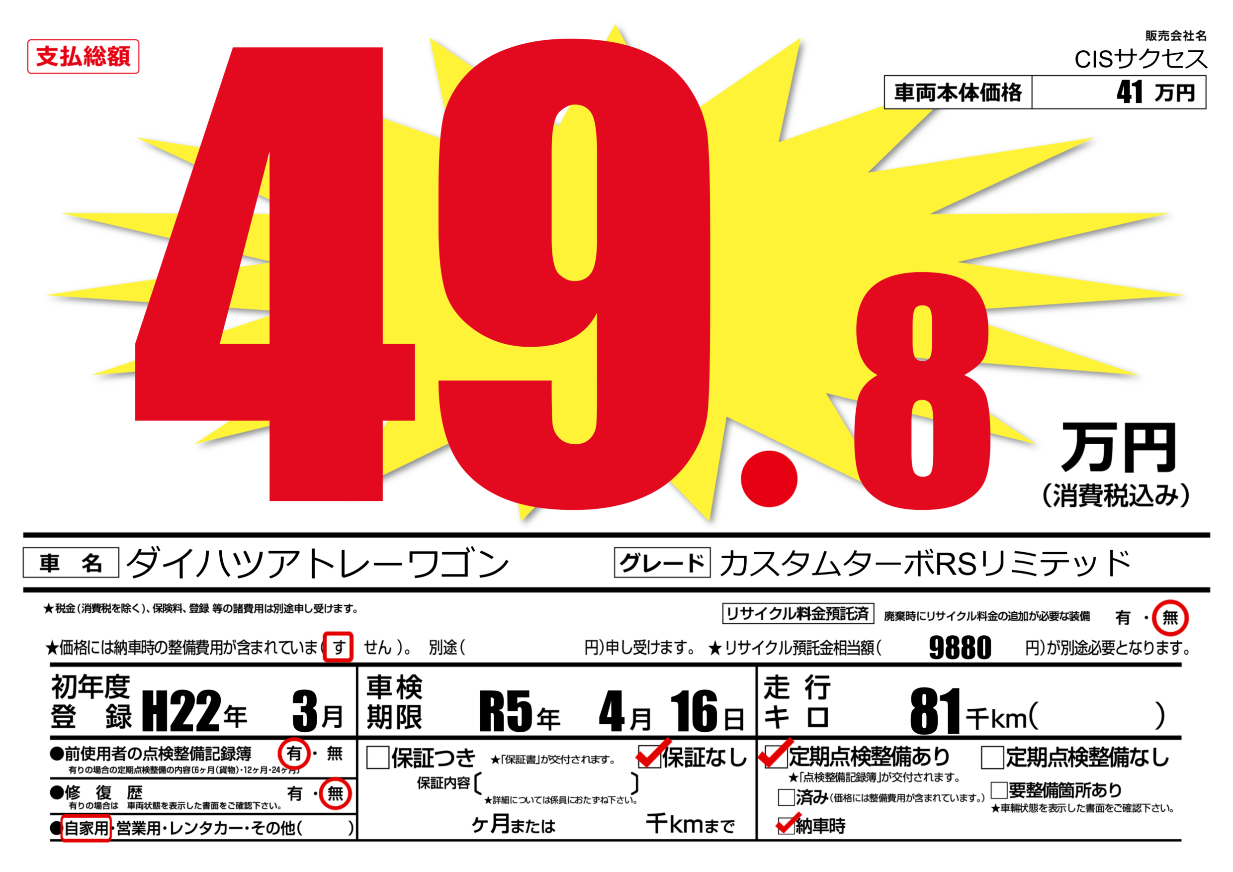 | 走行キロ | 8.1万km | 初年度登録 | H22年3月 |