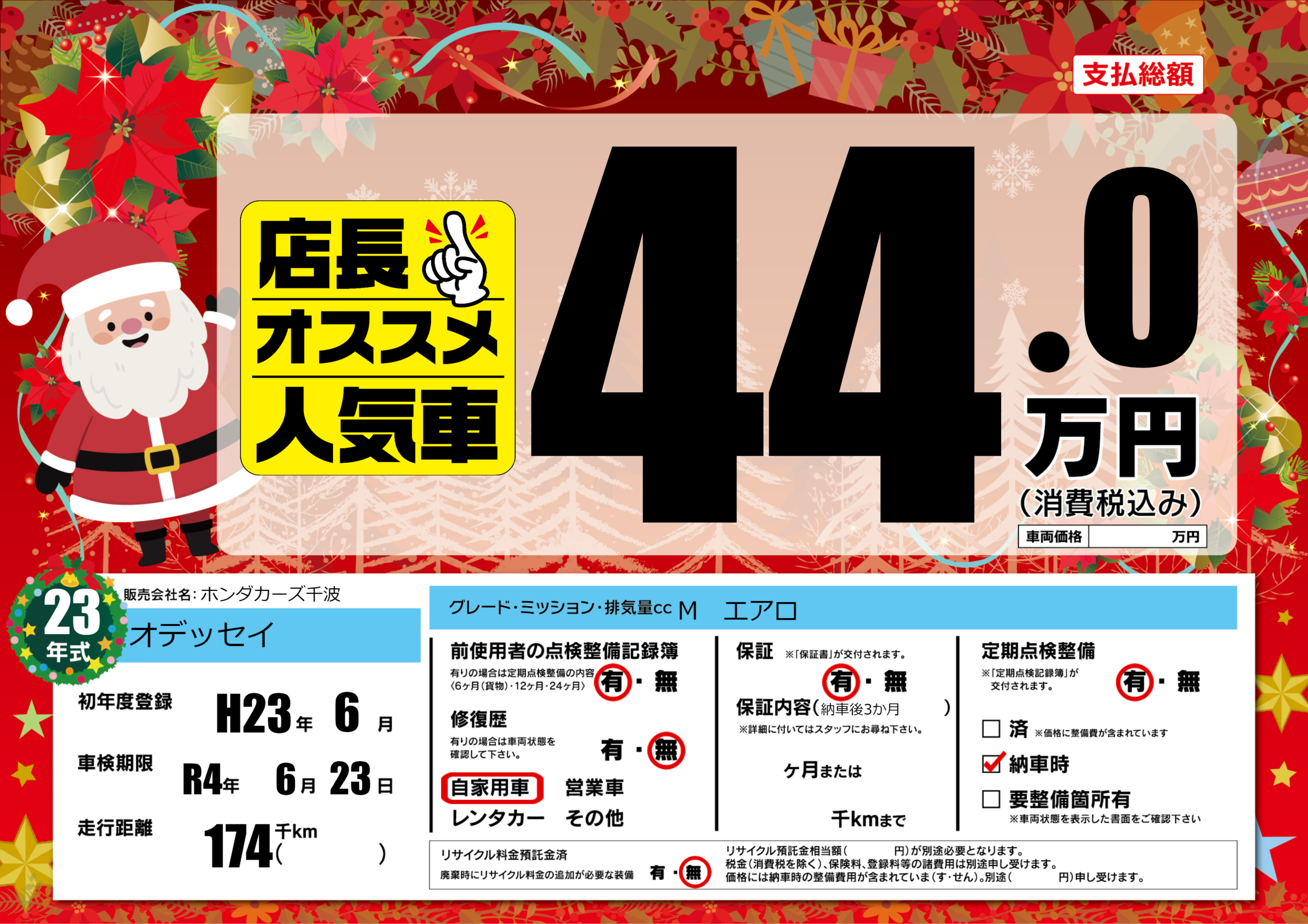 | 走行キロ | 17.4万km | 初年度登録 | H23年6月 |