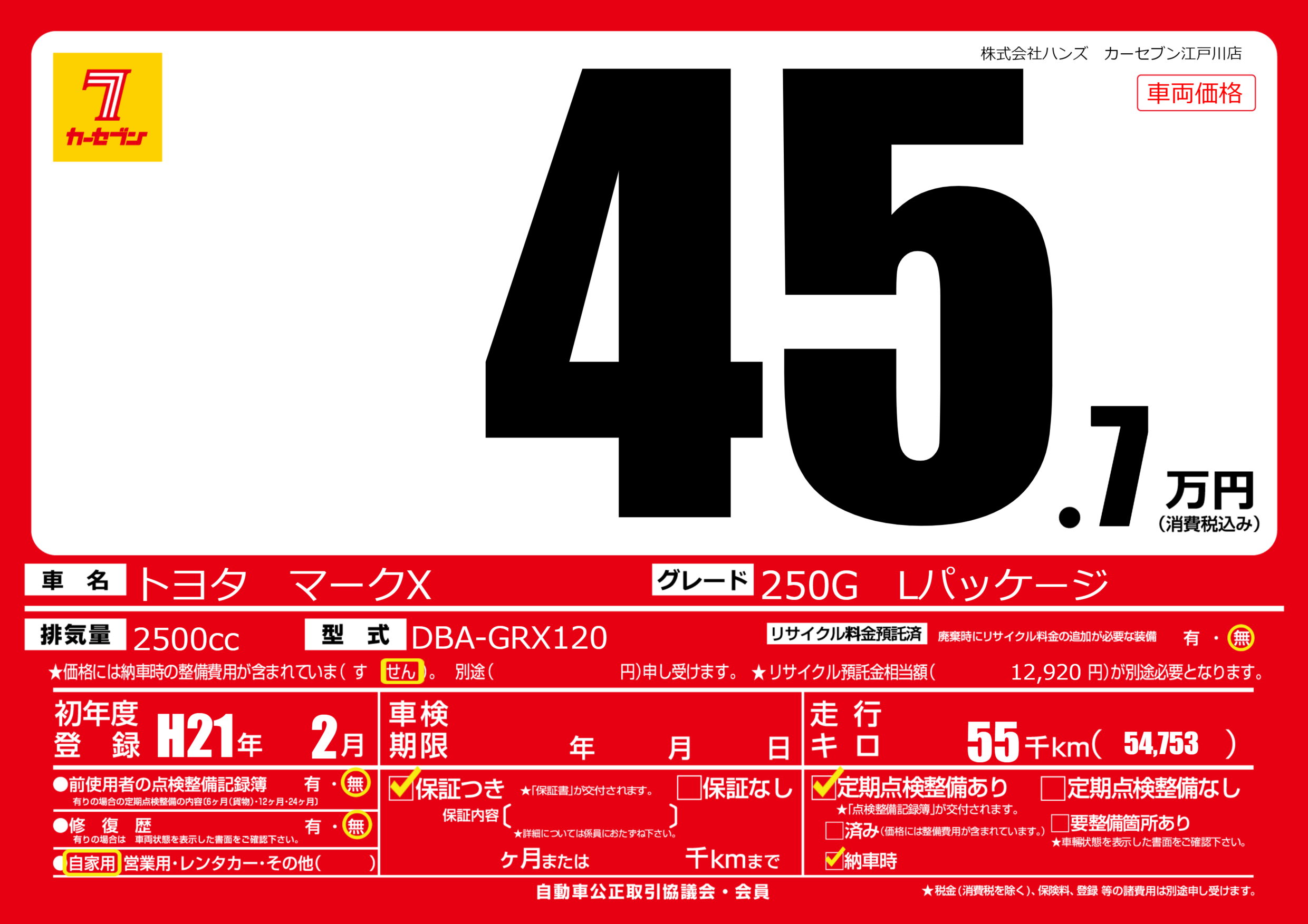 | 車名 | トヨタ マークX | グレード ミッション 排気量 |