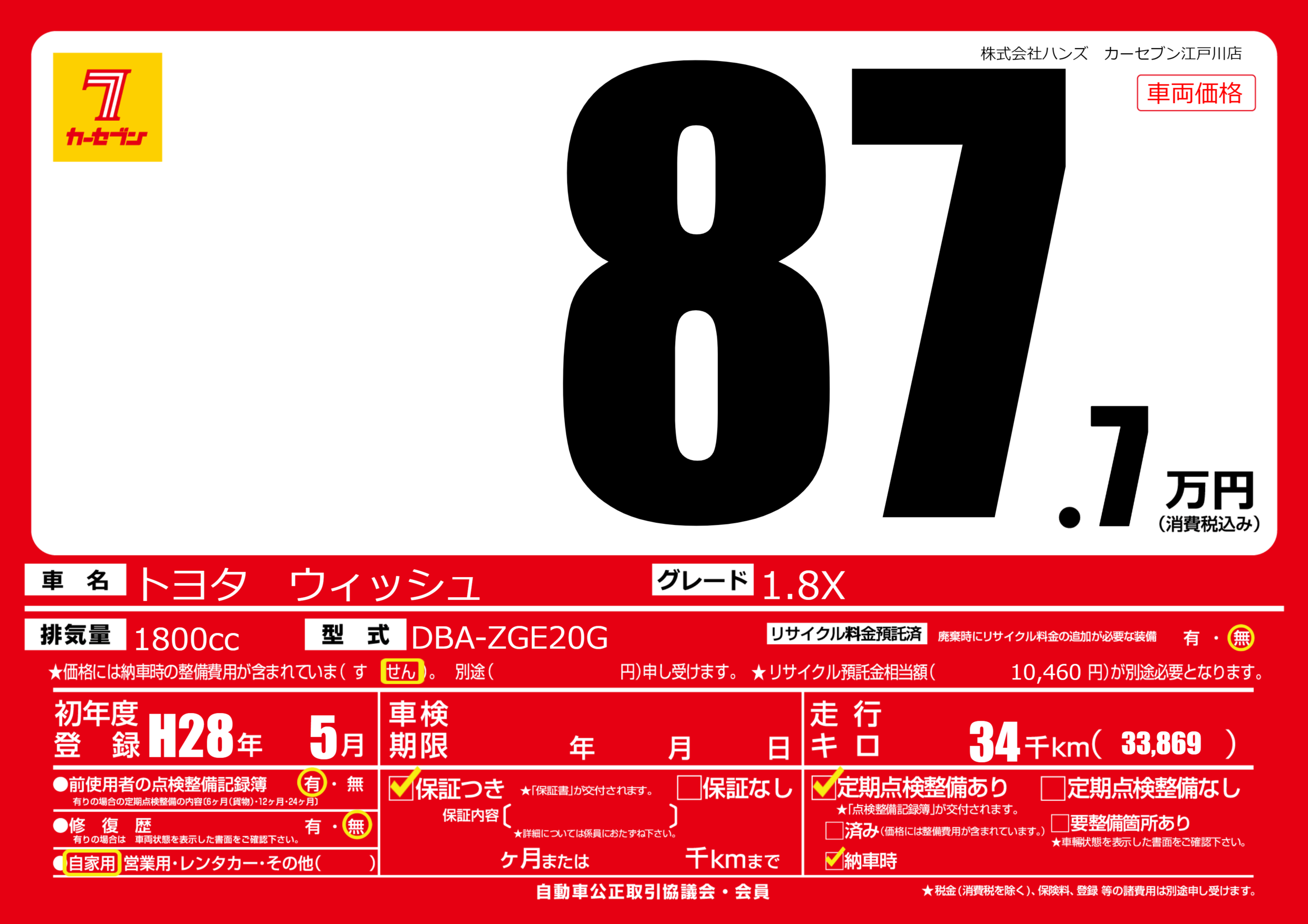 | 車名 | トヨタ ウィッシュ | グレード ミッション 排気量 |
