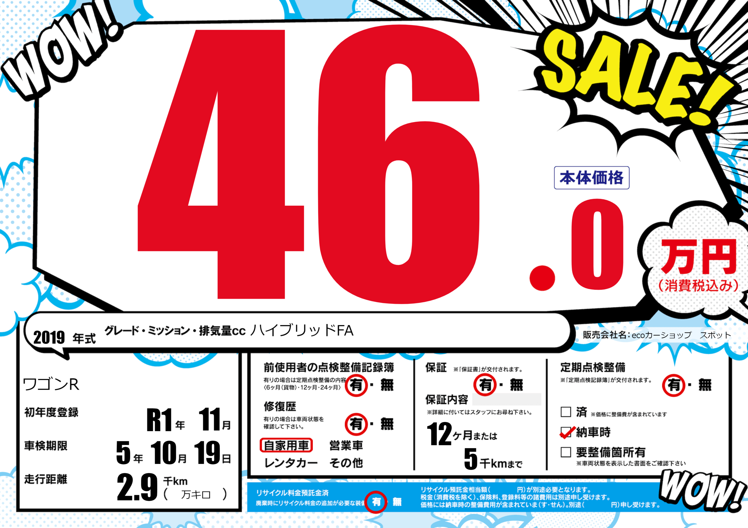 | 車名 | ワゴンR | グレード ミッション 排気量 |