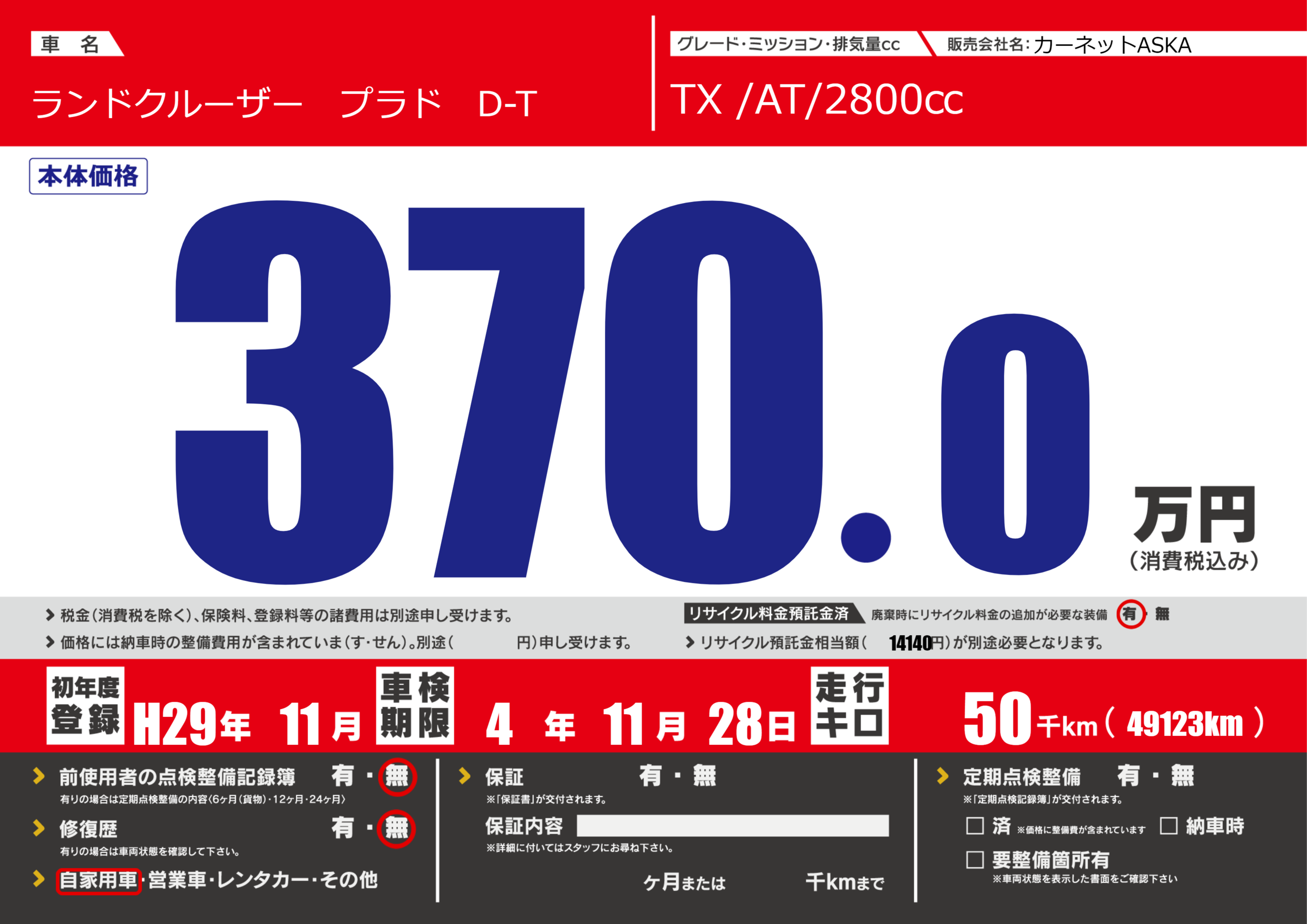 | 車名 | ランドクルーザー プラド D-T | グレード ミッション 排気量 |
