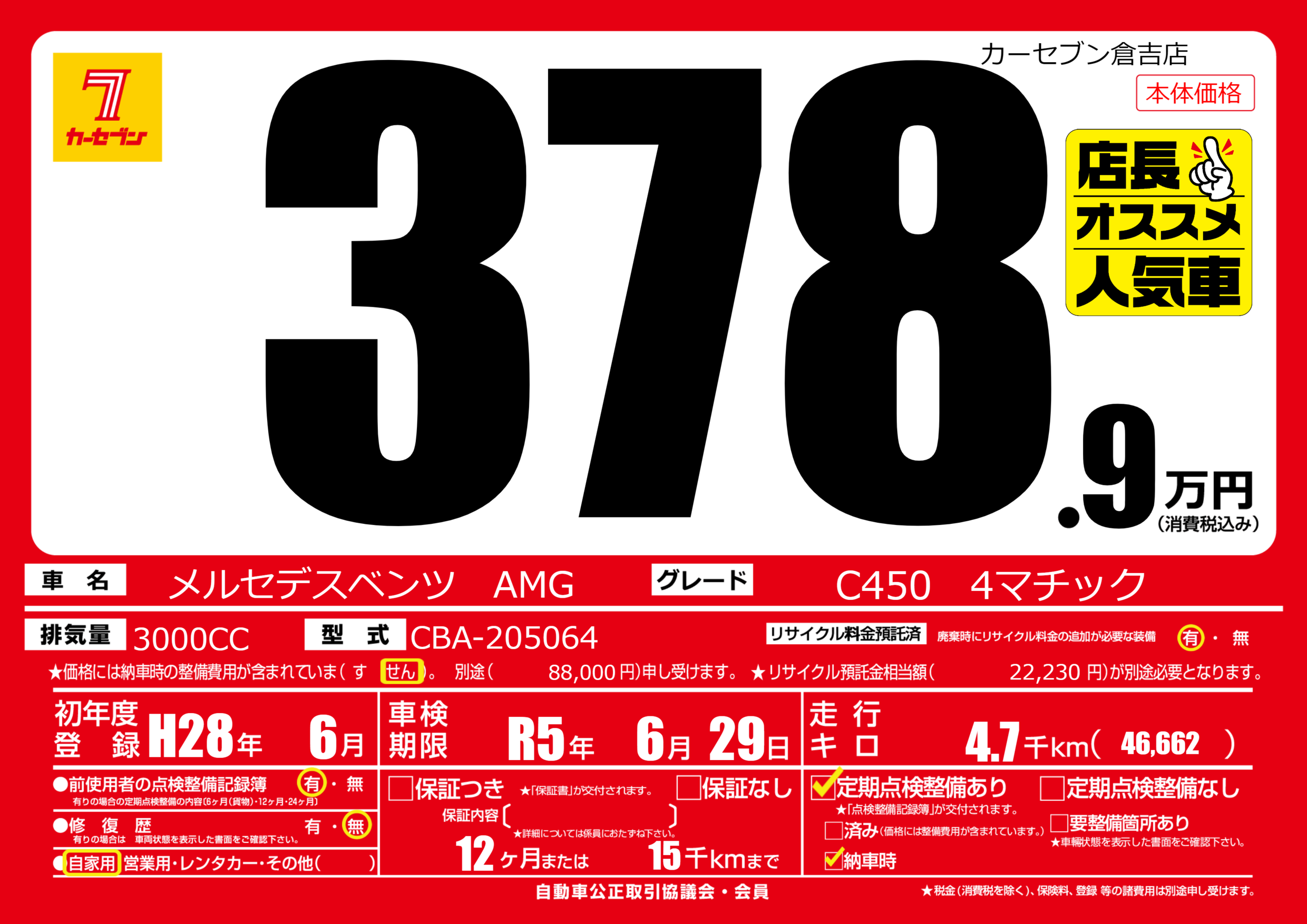 | 定期点検整備 | 定期点検整備あり 納車時あり | ||