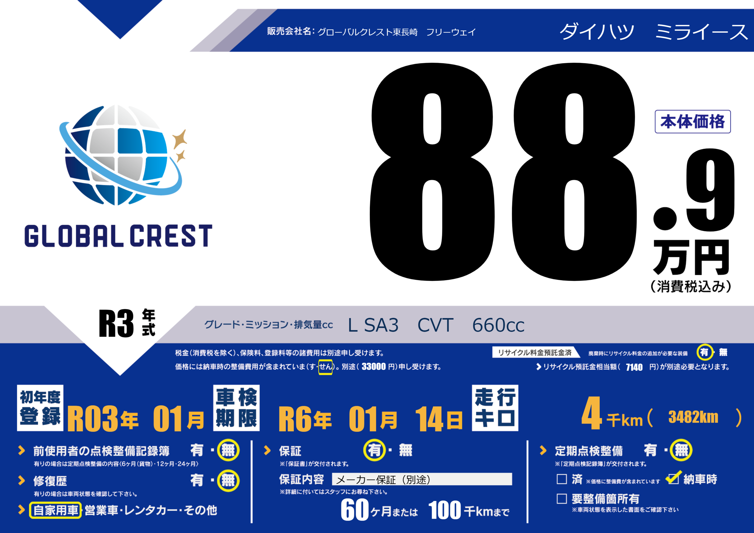 | 走行キロ | 0.4万km | 初年度登録 | R03年01月 |