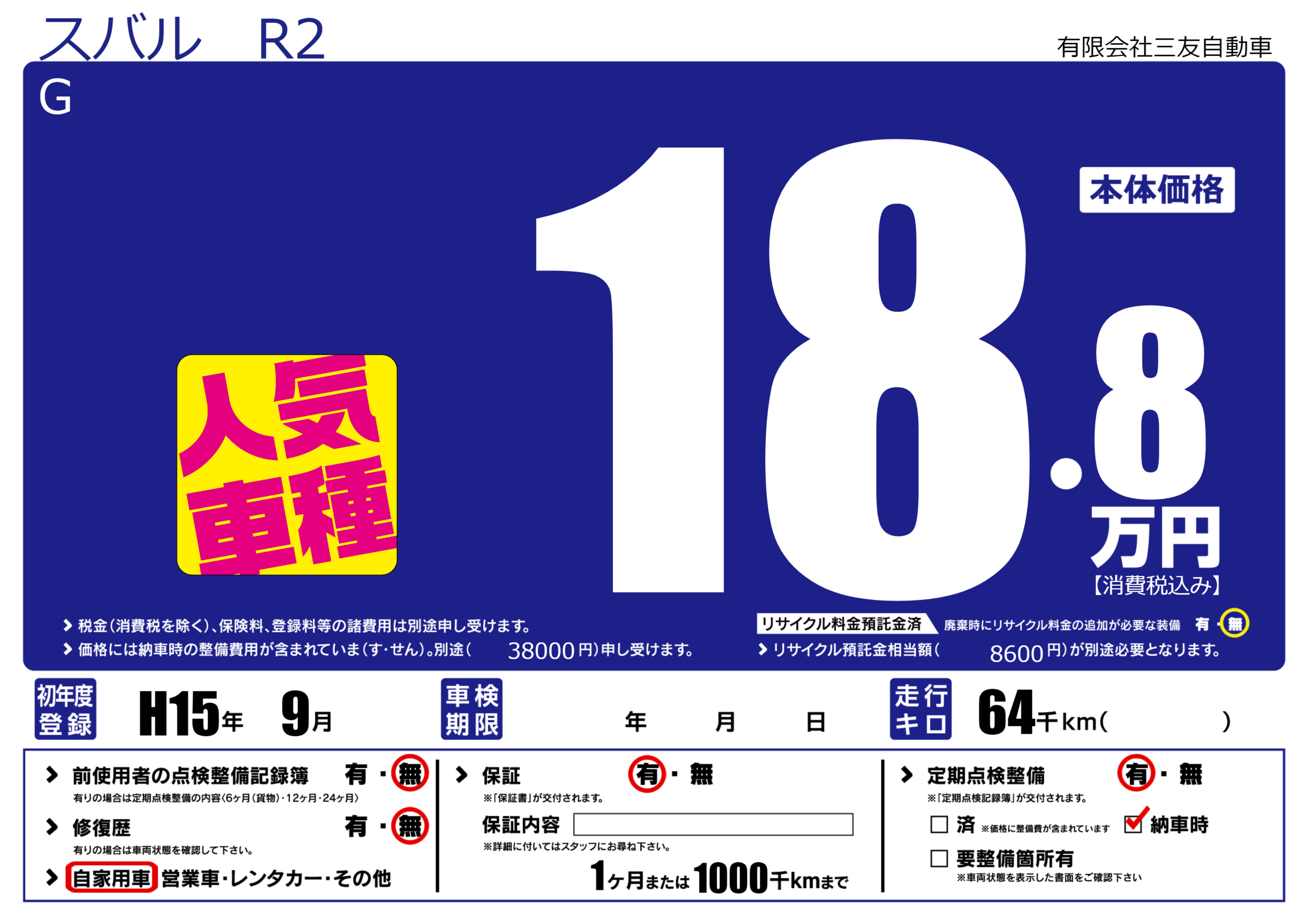 | 走行キロ | 6.4万km | 初年度登録 | H15年9月 |
