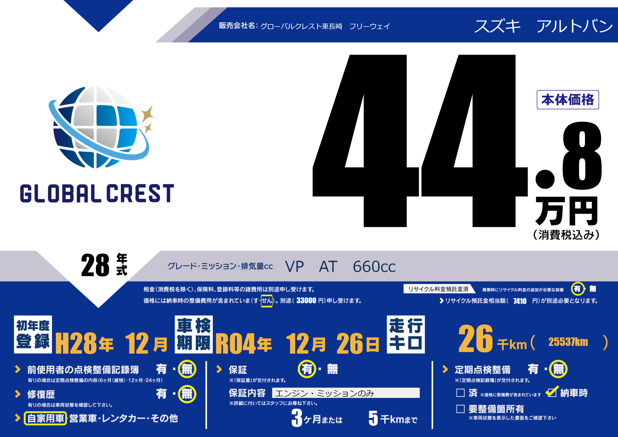 | 車名 | スズキ アルトバン | グレード ミッション 排気量 |