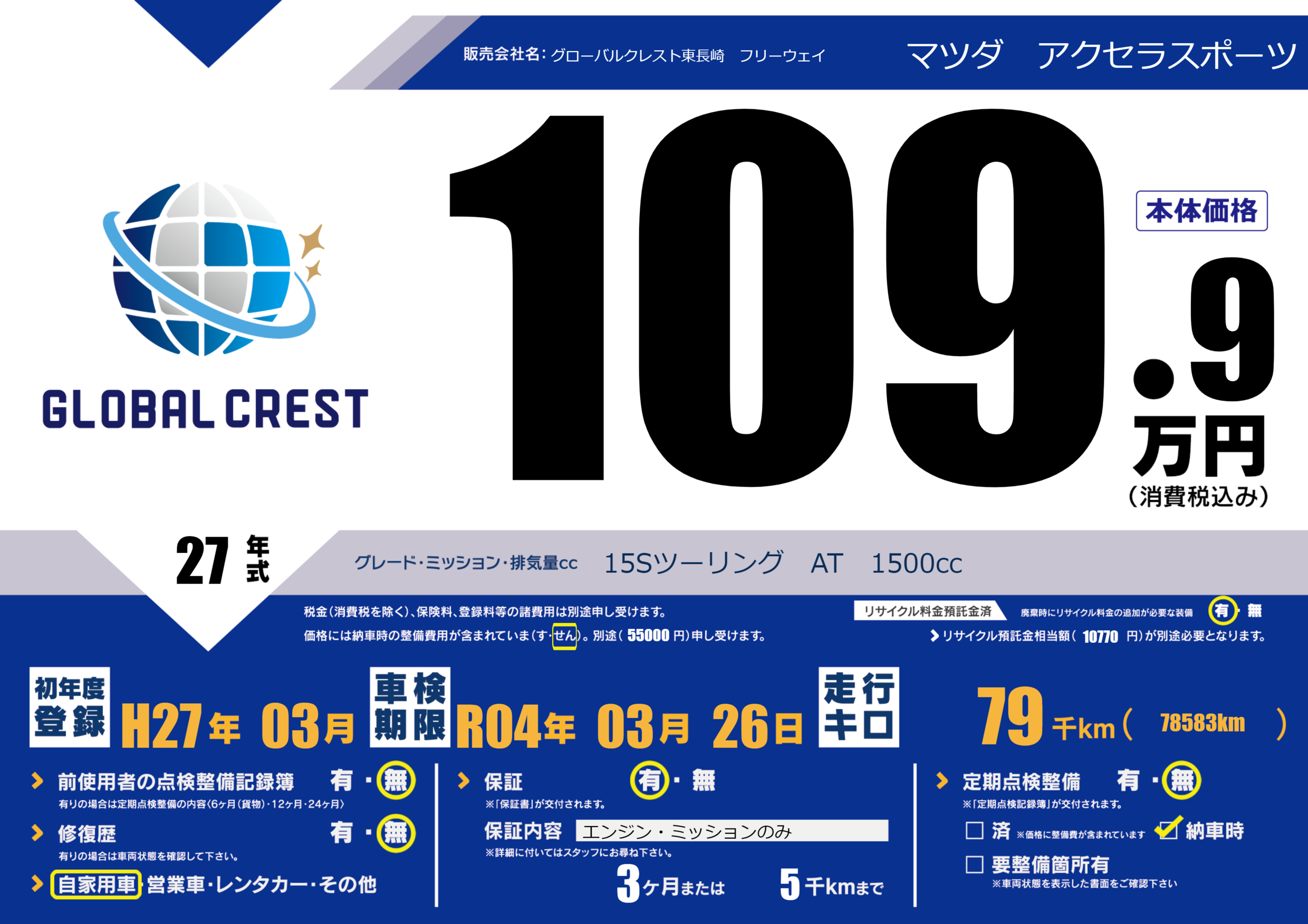 | 車名 | マツダ アクセラスポーツ | グレード ミッション 排気量 |