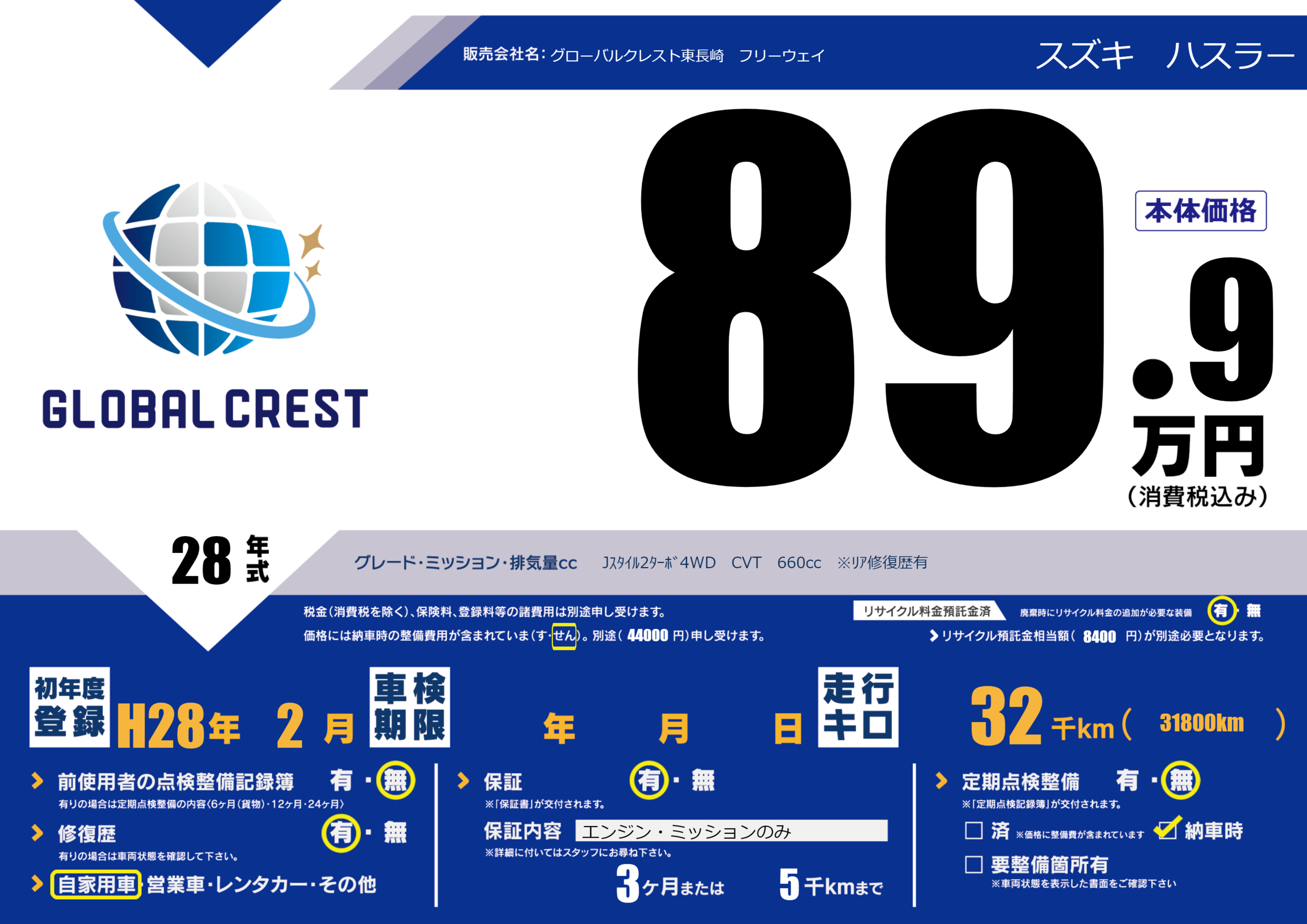 | 走行キロ | 3.2万km | 初年度登録 | H28年2月 |