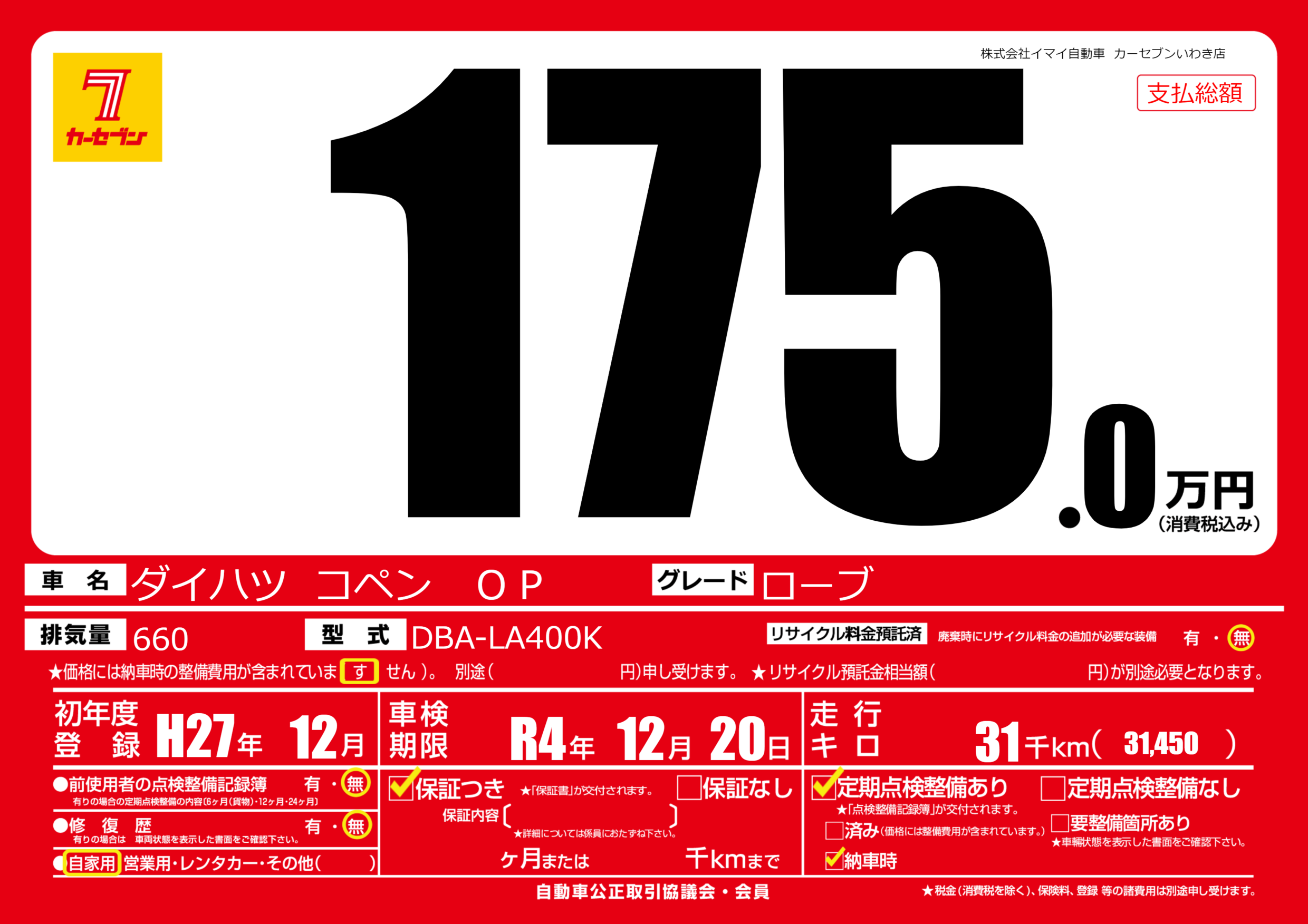 | 車名 | ダイハツ コペン OP | グレード ミッション 排気量 |