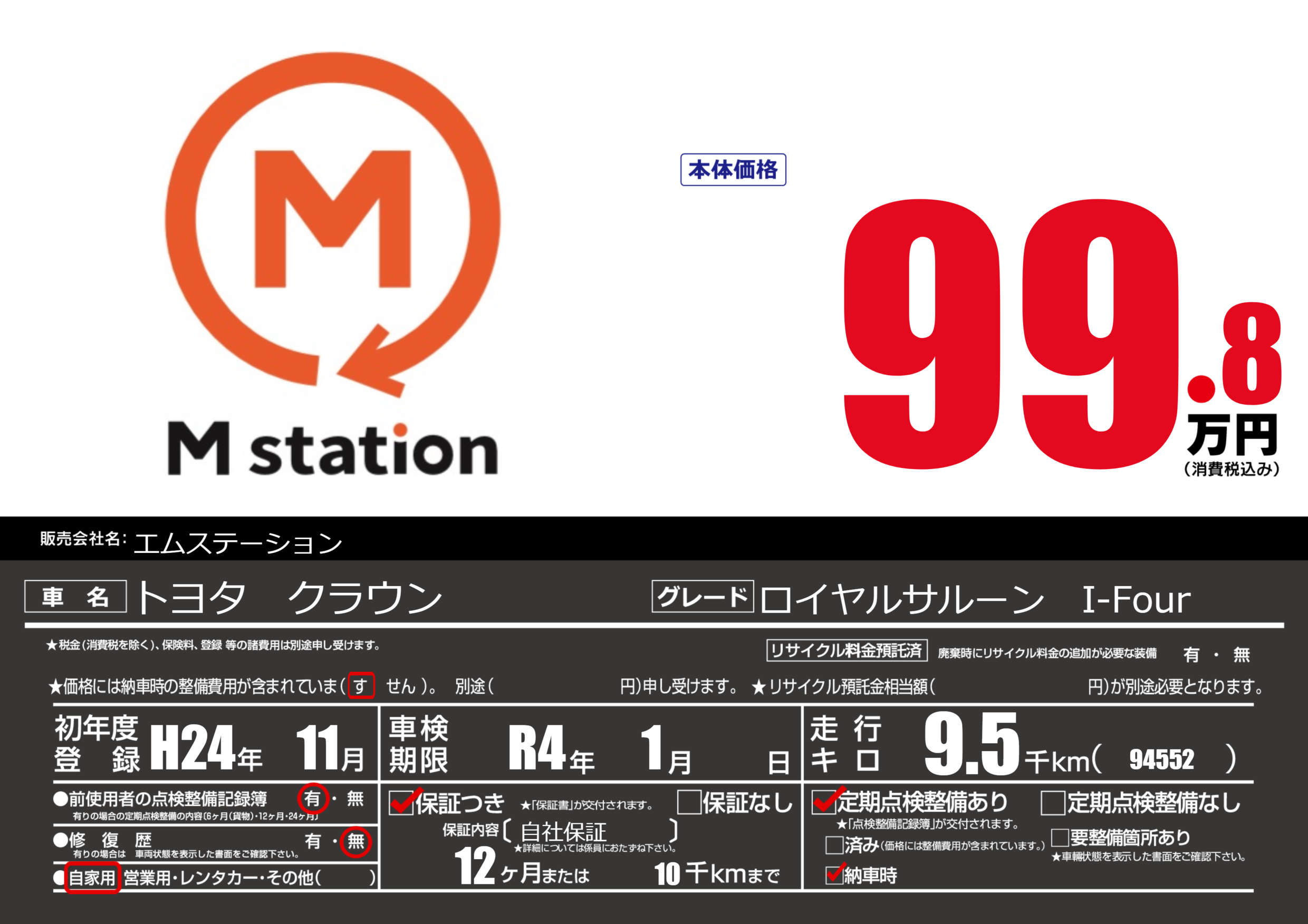 | 車名 | トヨタ クラウン | グレード ミッション 排気量 |