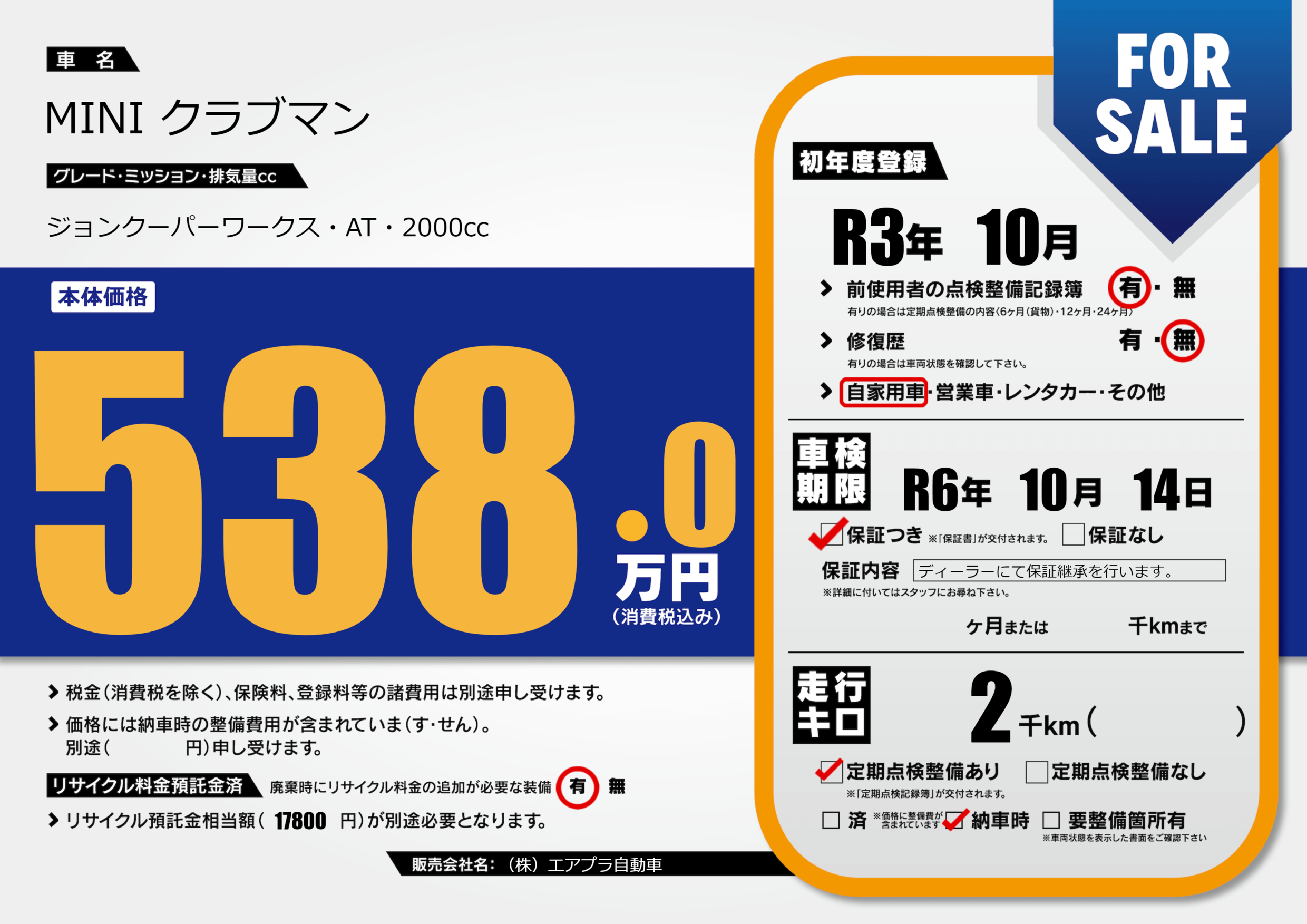 保証付き 保証内容(ディーラーにて保証継承を行います。) ---ヶ月または()千kmまで |