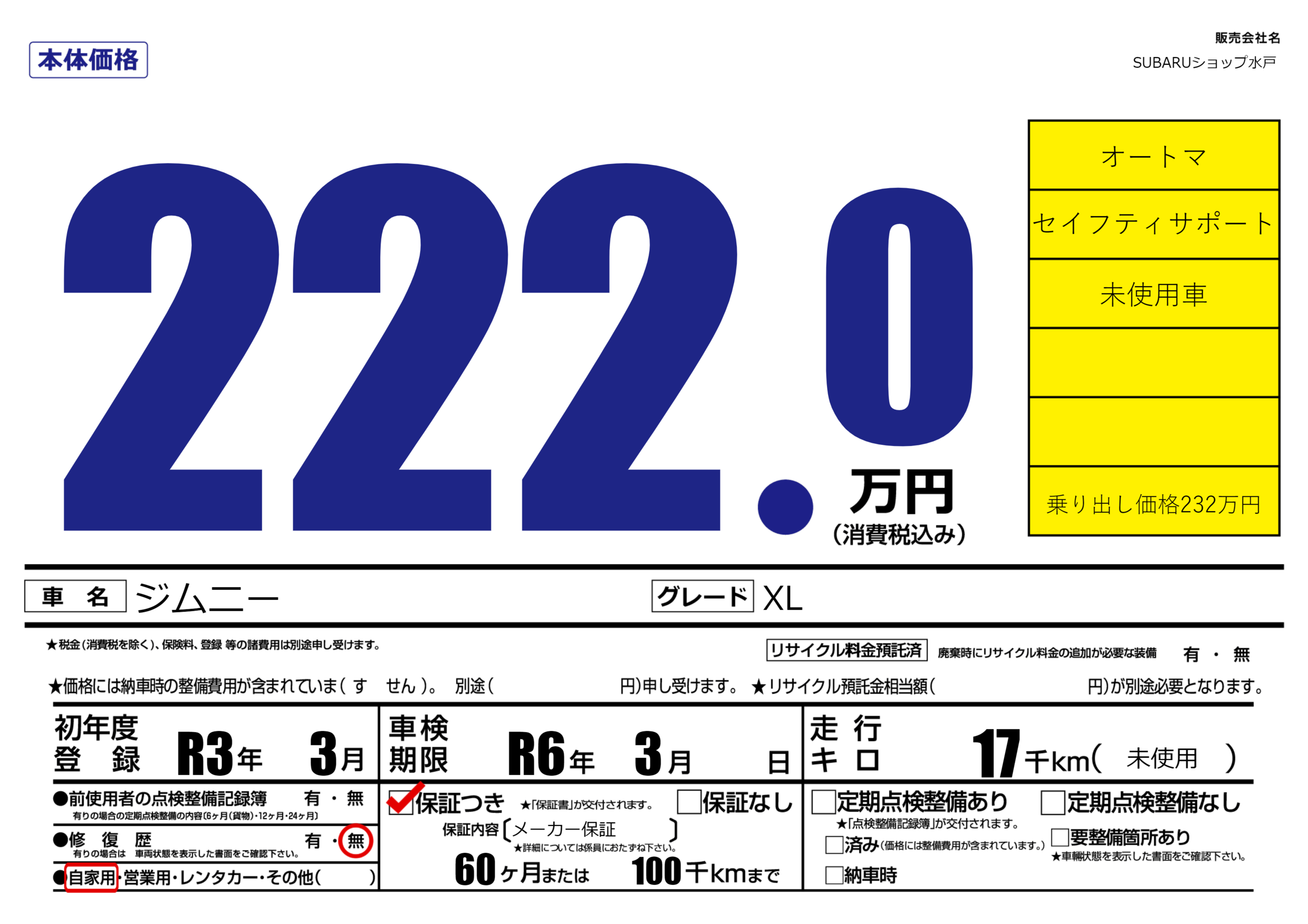 | 車名 | ジムニー | グレード ミッション 排気量 |