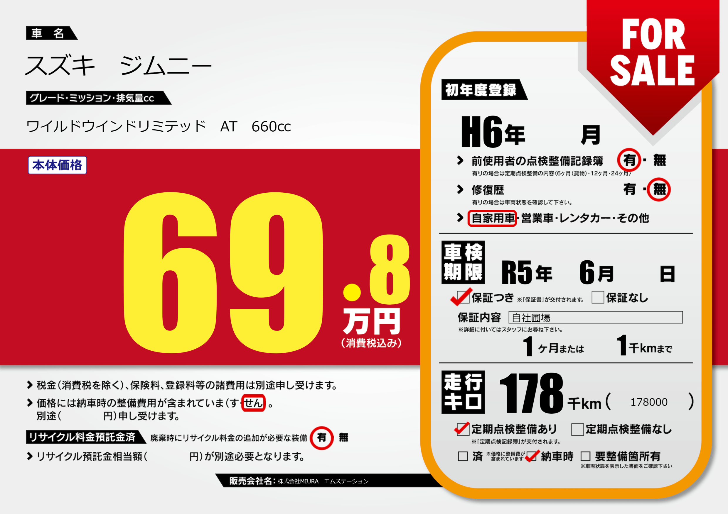 | 走行キロ | 17.8万km | 初年度登録 | H6年---月 |