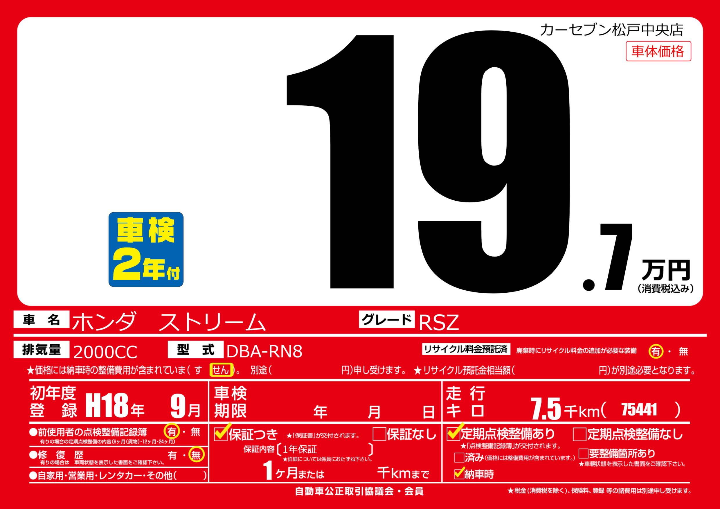 | 車名 | ホンダ ストリーム | グレード ミッション 排気量 |