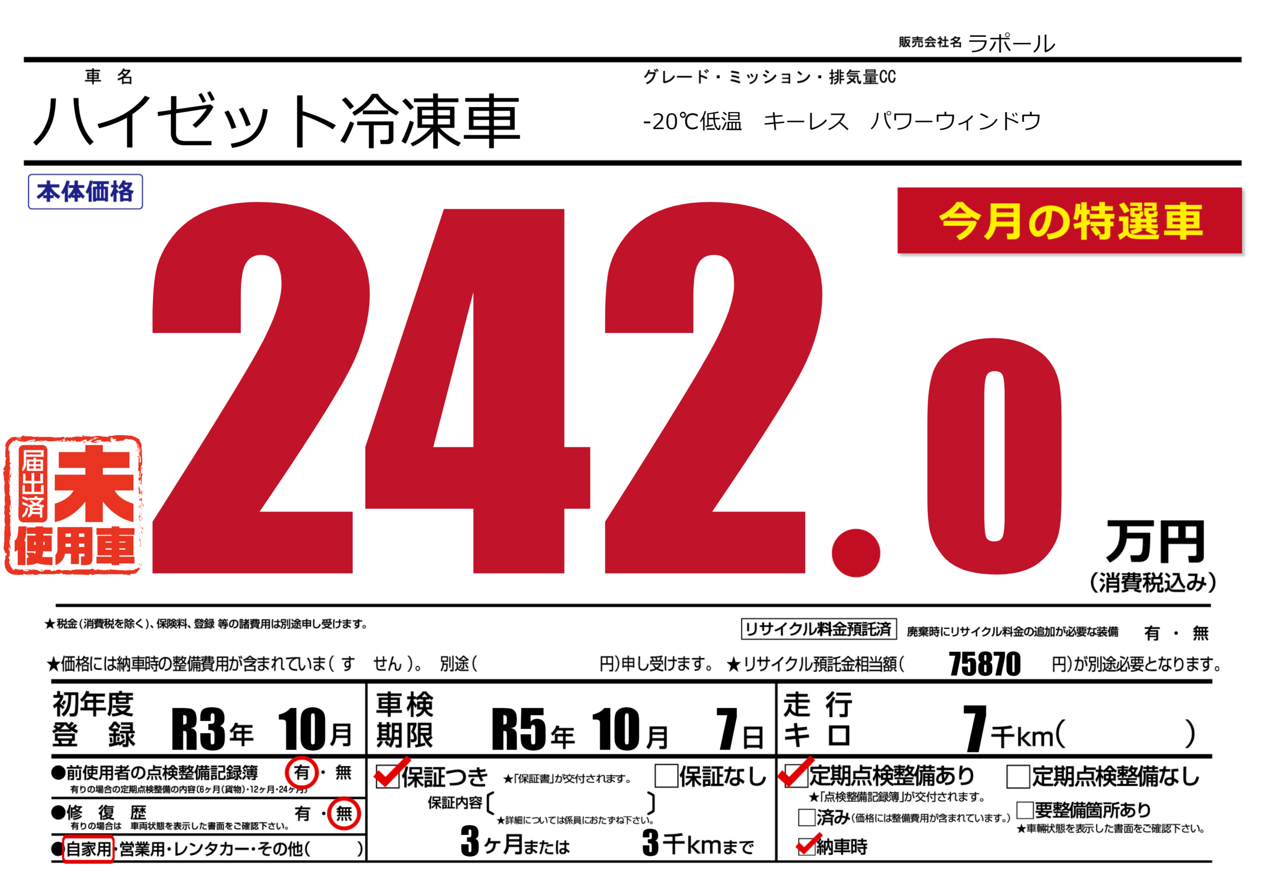 | 車名 | ハイゼット冷凍車 | グレード ミッション 排気量 |
