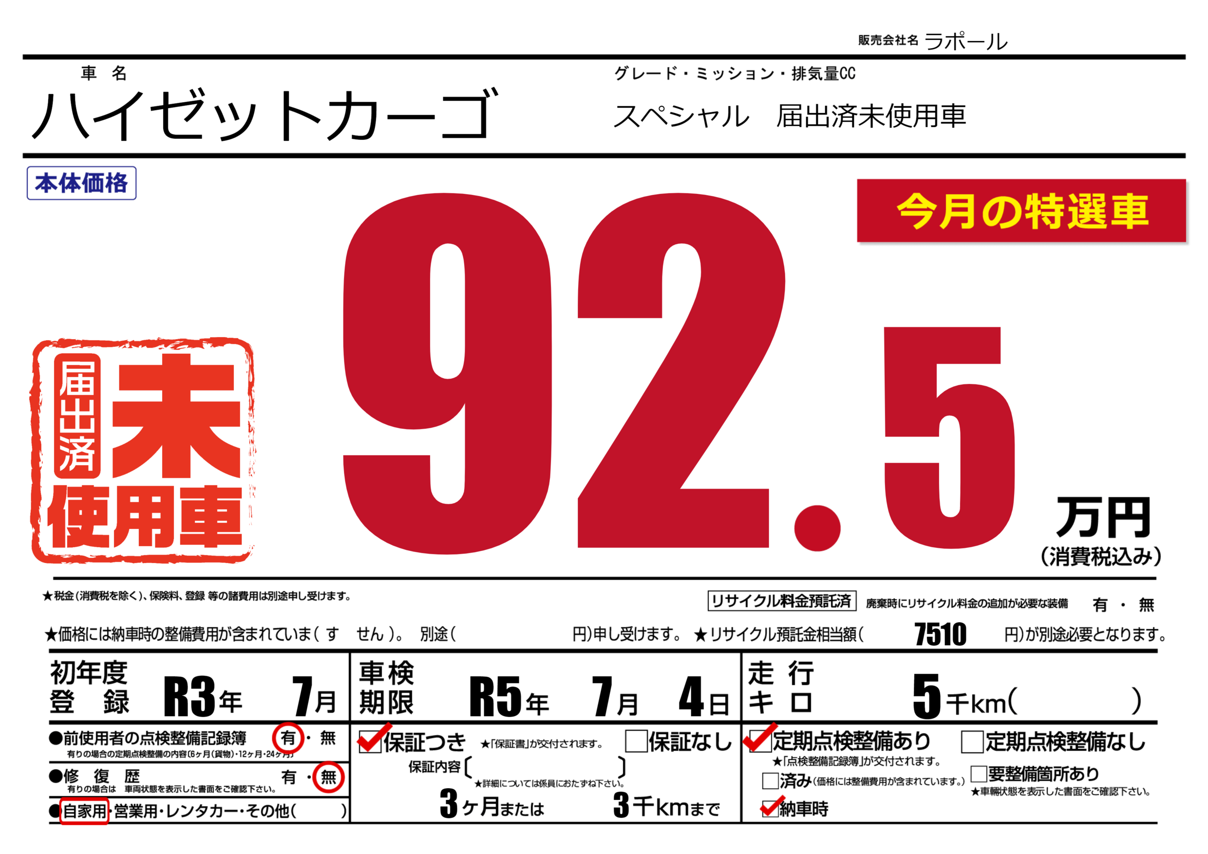 保証付き 保証内容(---) 3ヶ月または(3)千kmまで |
