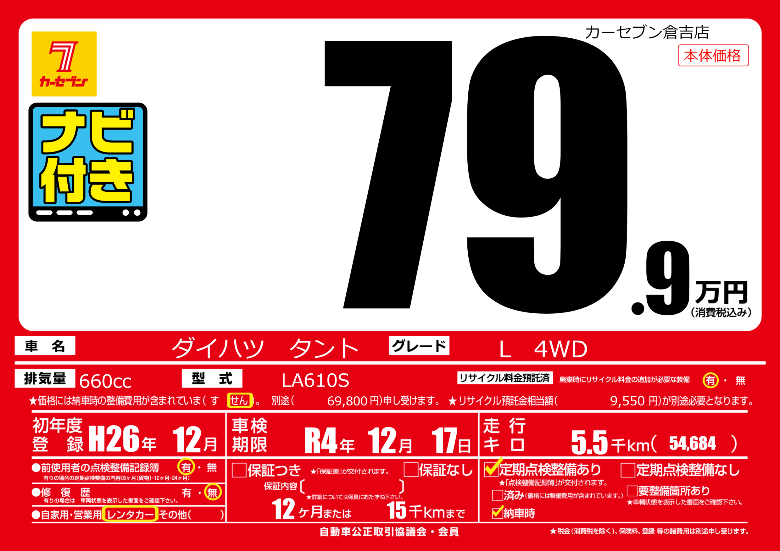 | 定期点検整備 | 定期点検整備あり 納車時あり | ||