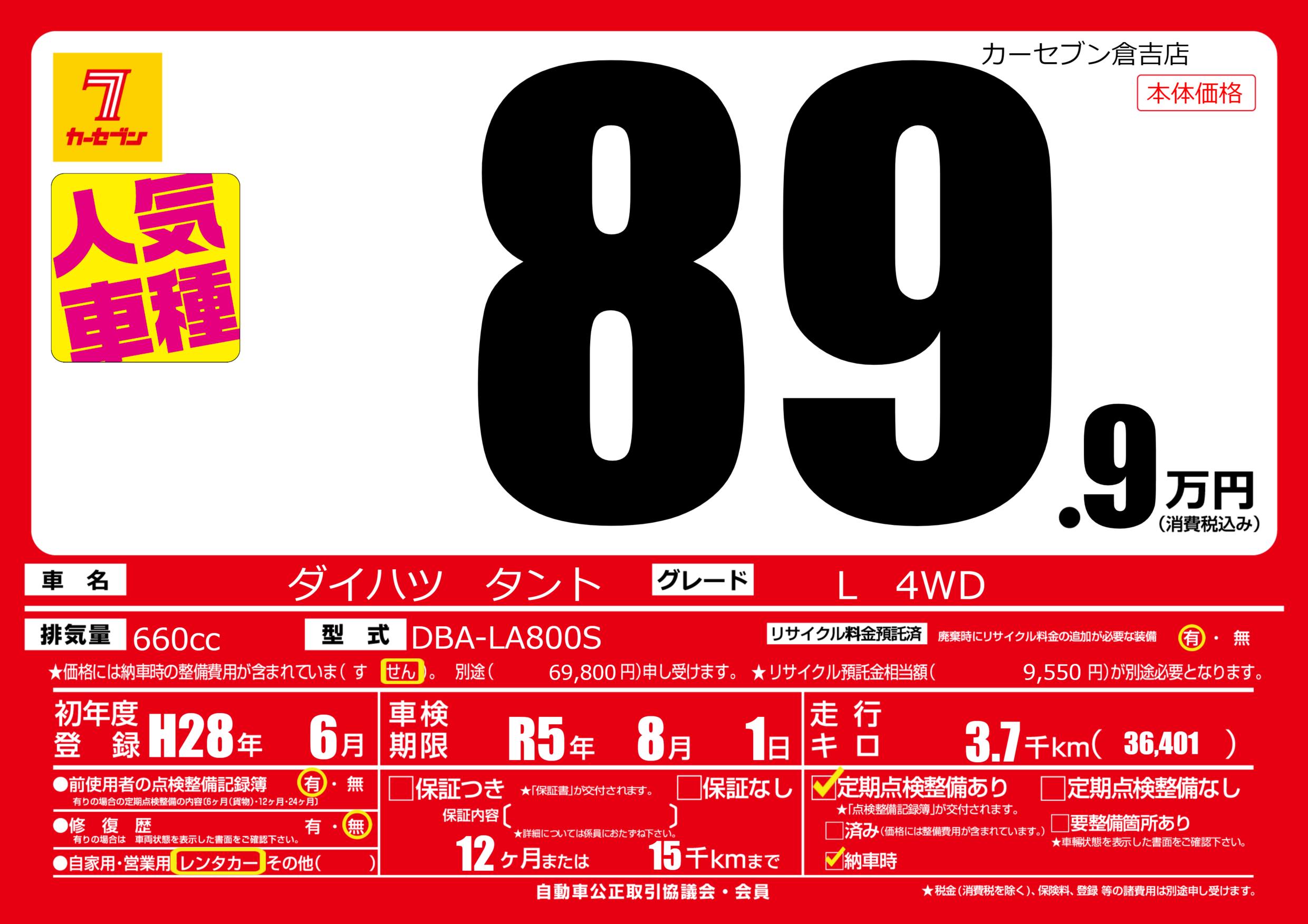 | 定期点検整備 | 定期点検整備あり 納車時あり | ||