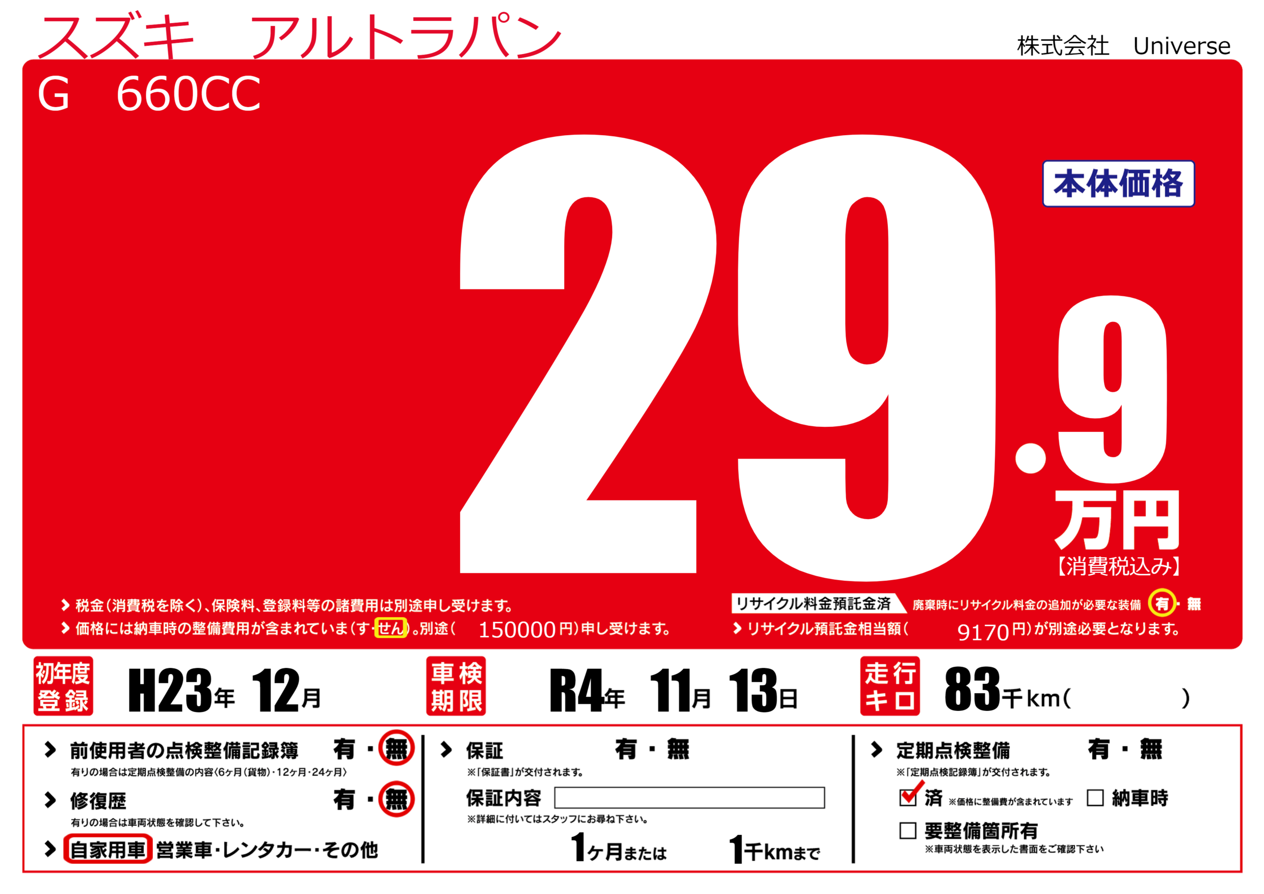 | 走行キロ | 8.3万km | 初年度登録 | H23年12月 |