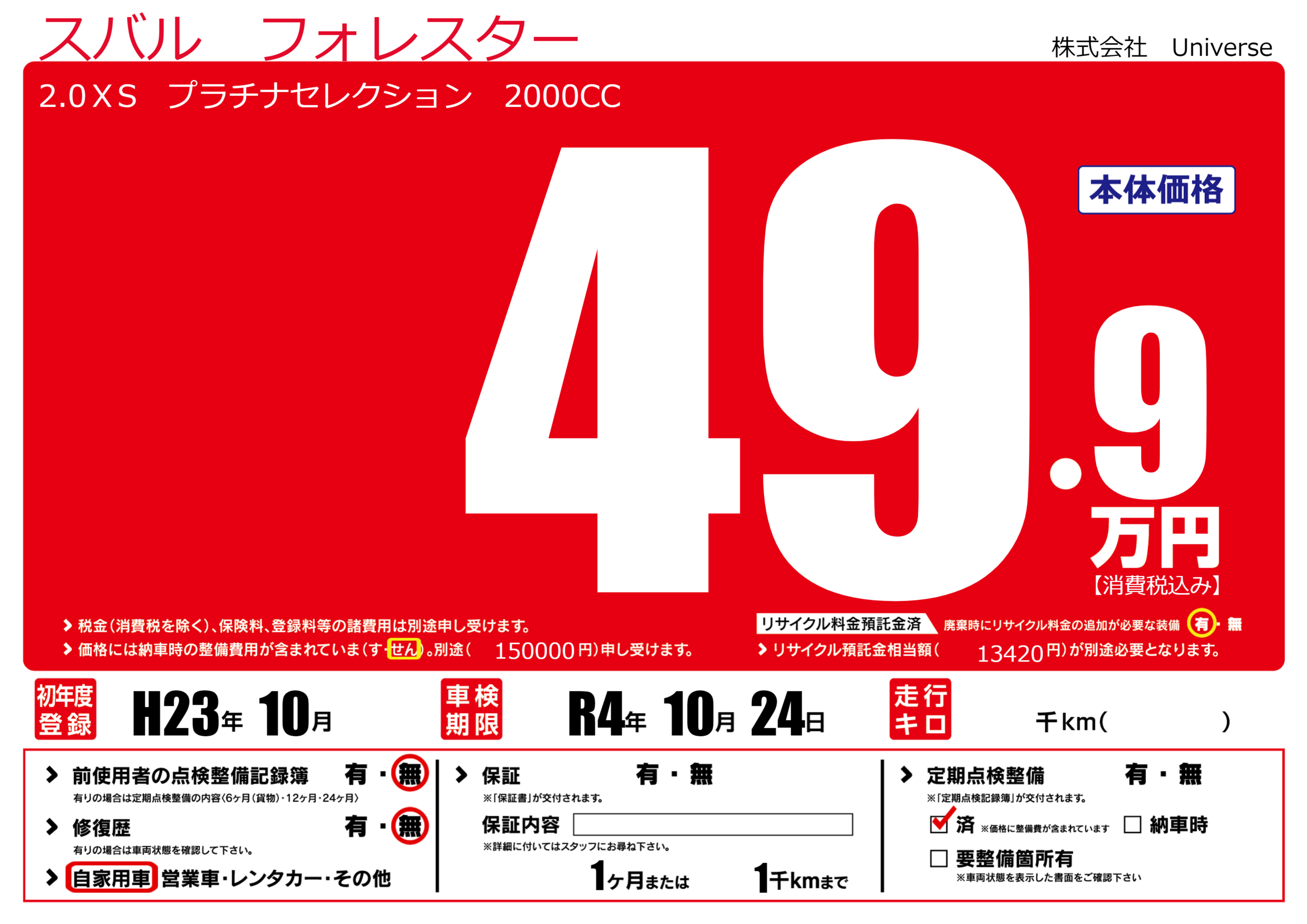 | 車名 | スバル フォレスター | グレード ミッション 排気量 |