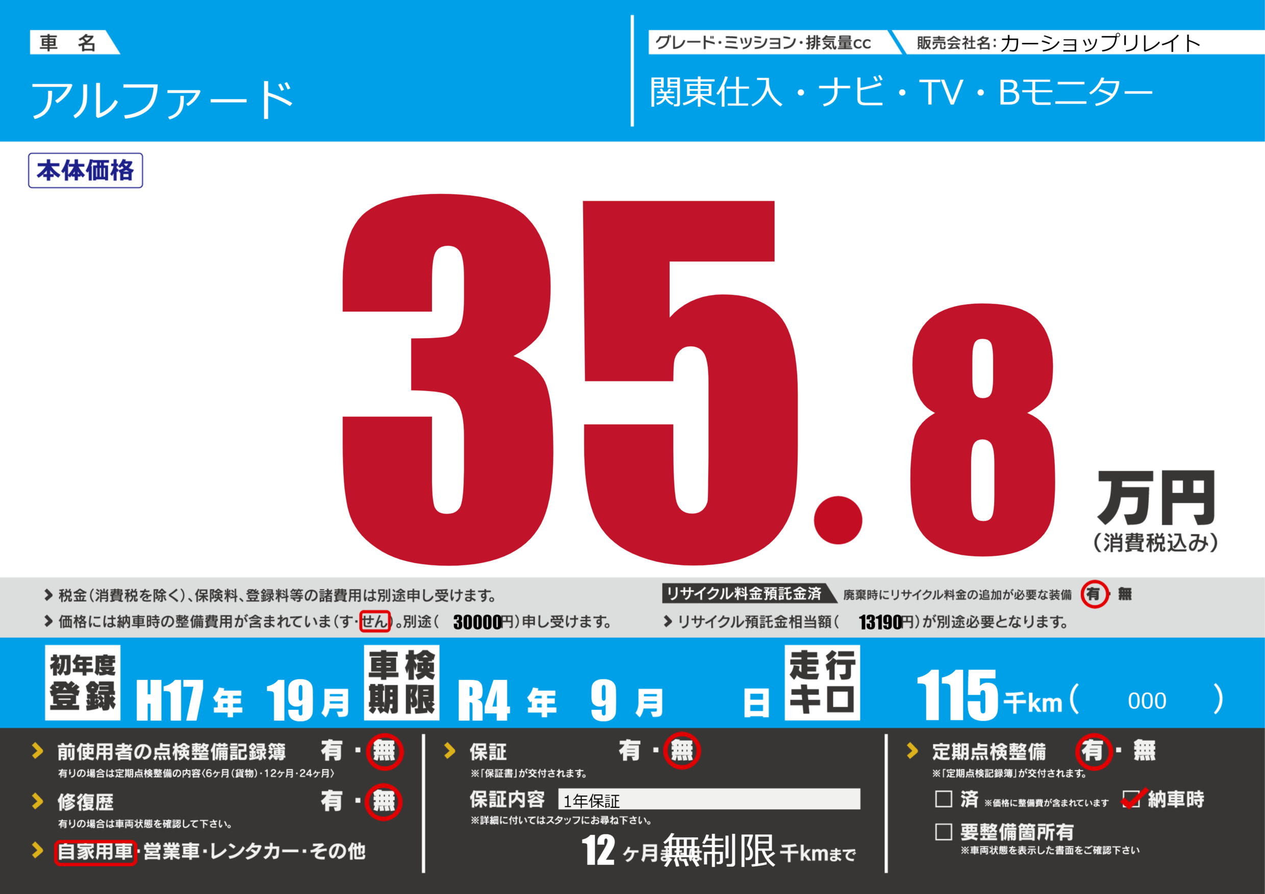 | 車検制限 | R4年 9月 - 日 | ||