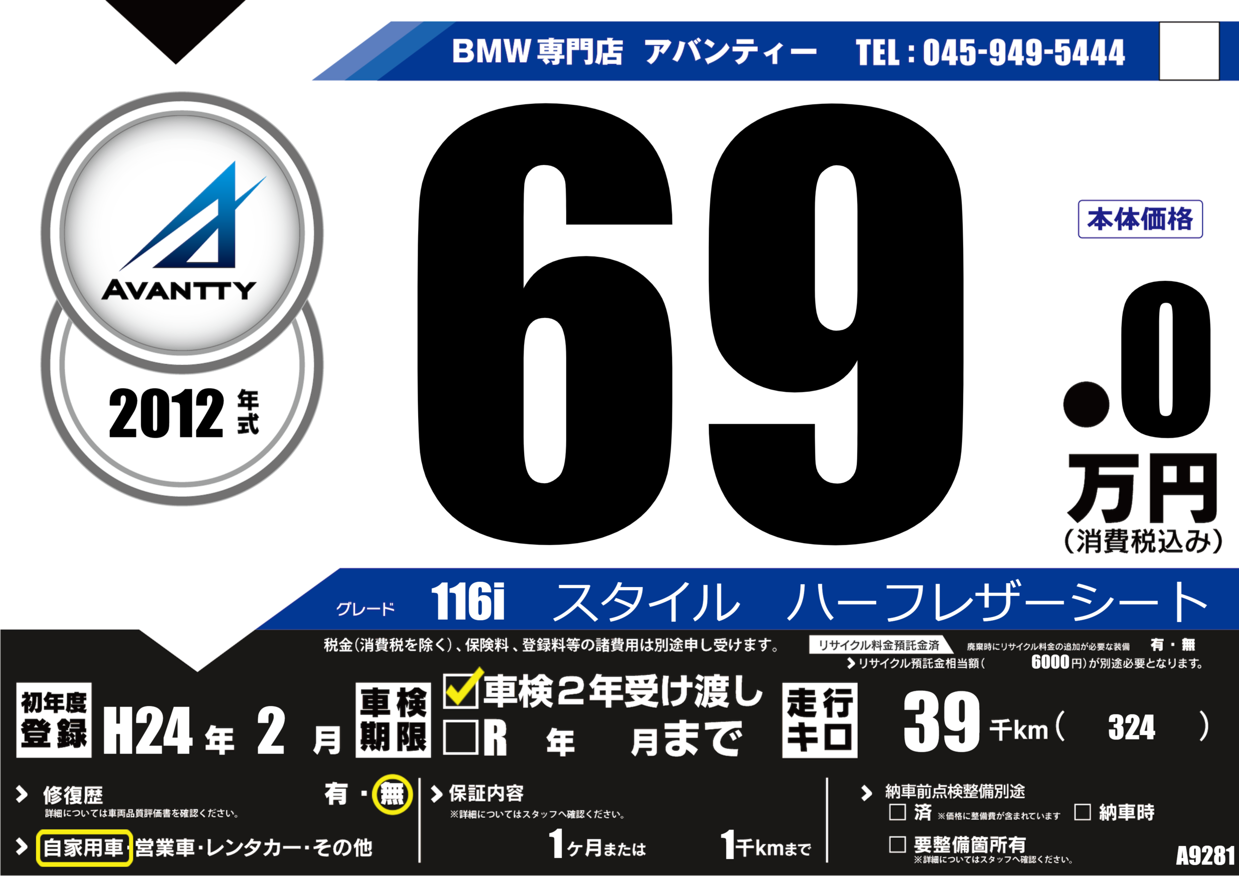 | 走行キロ | 3.9万km | 初年度登録 | H24年2月 |
