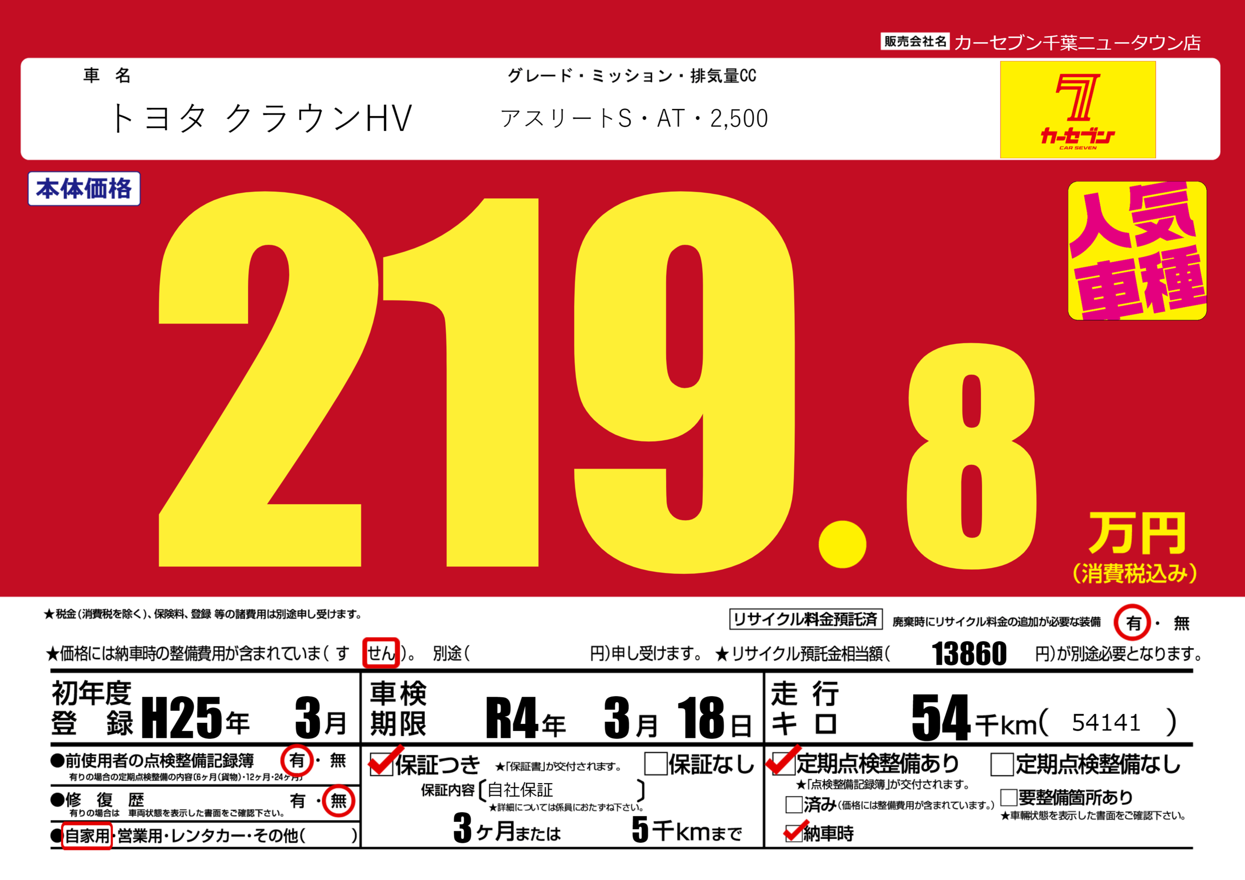 | 車名 | トヨタ クラウンHV | グレード ミッション 排気量 |