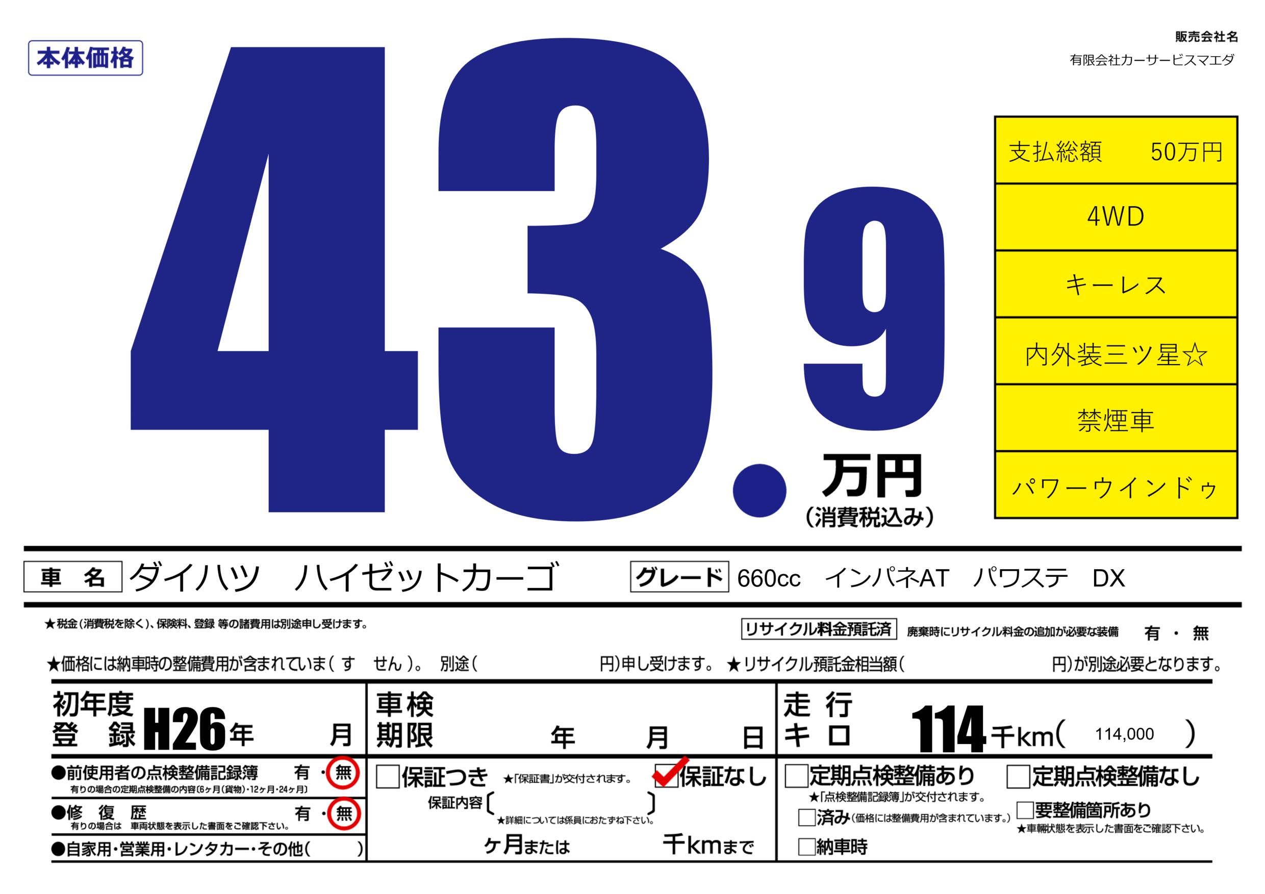 | 車名 | ダイハツ ハイゼットカーゴ | グレード ミッション 排気量 |
