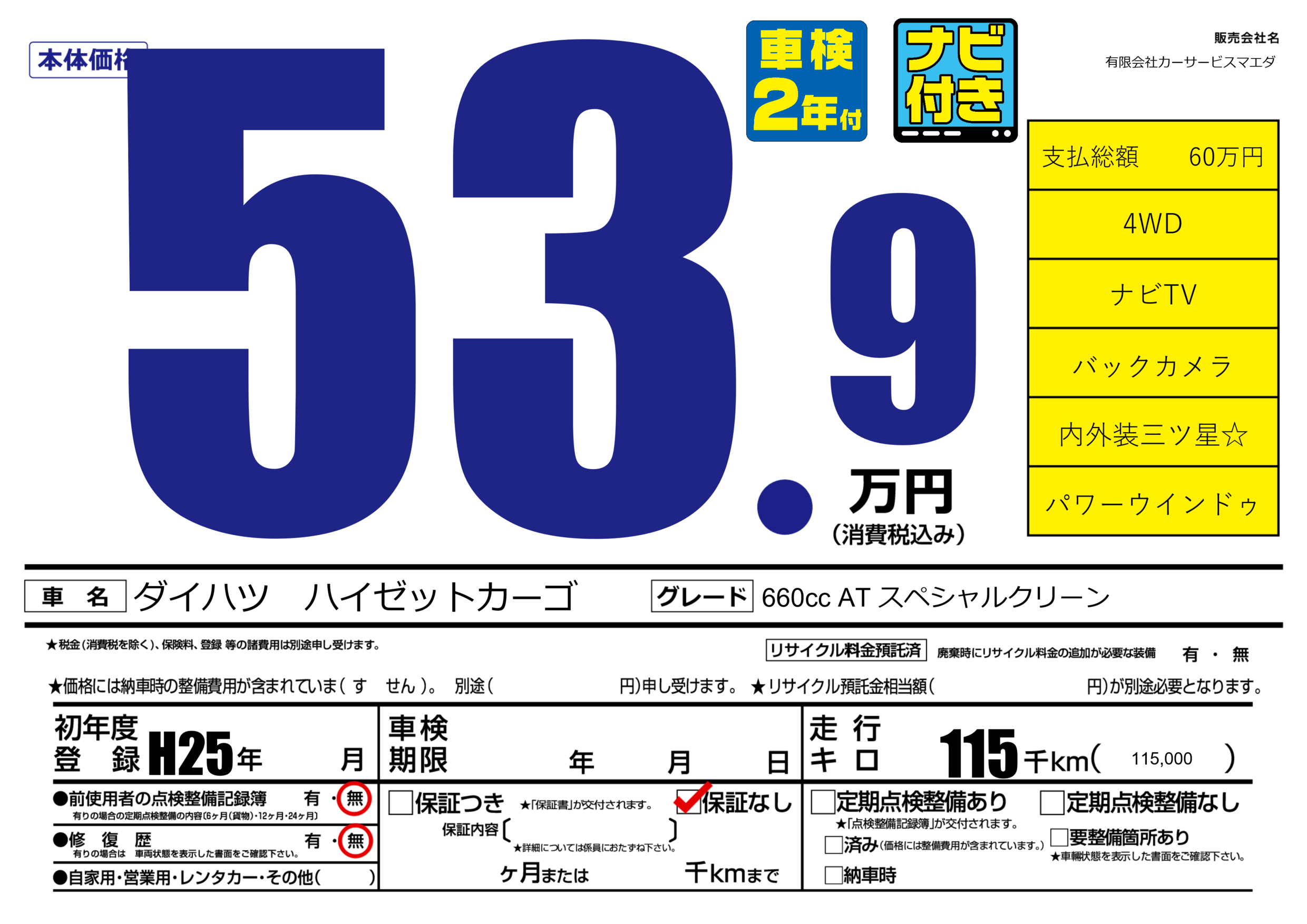| 車名 | ダイハツ ハイゼットカーゴ | グレード ミッション 排気量 |