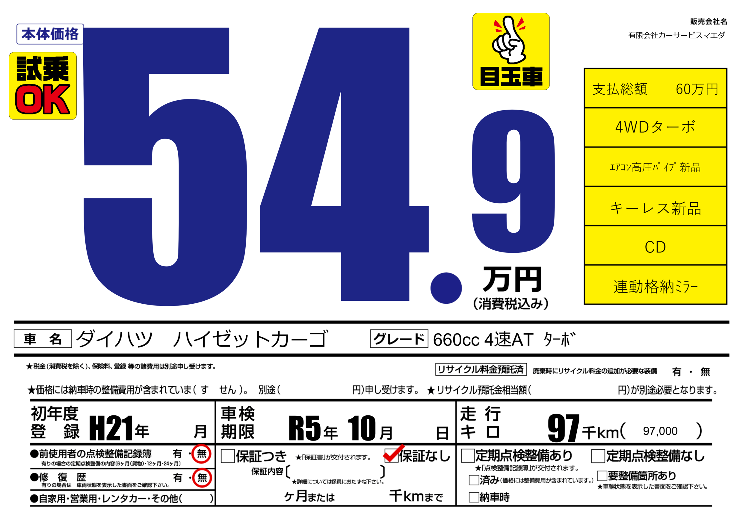 なし | 車検制限 | R5年10月---月 |