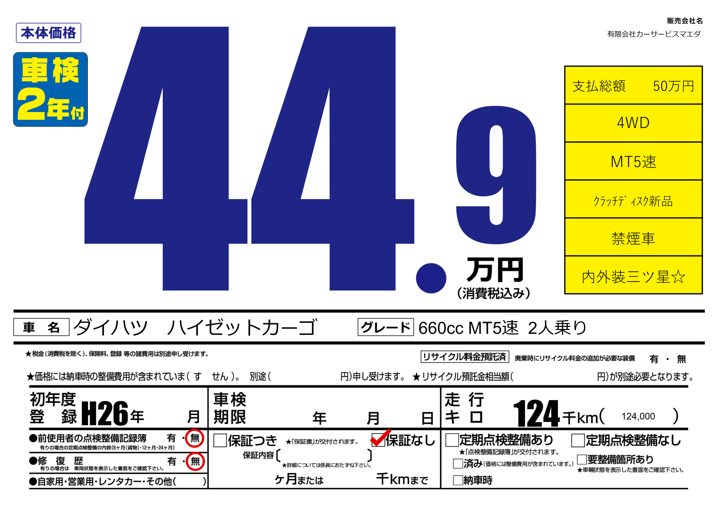 | 車名 | ダイハツ ハイゼットカーゴ | グレード ミッション 排気量 |