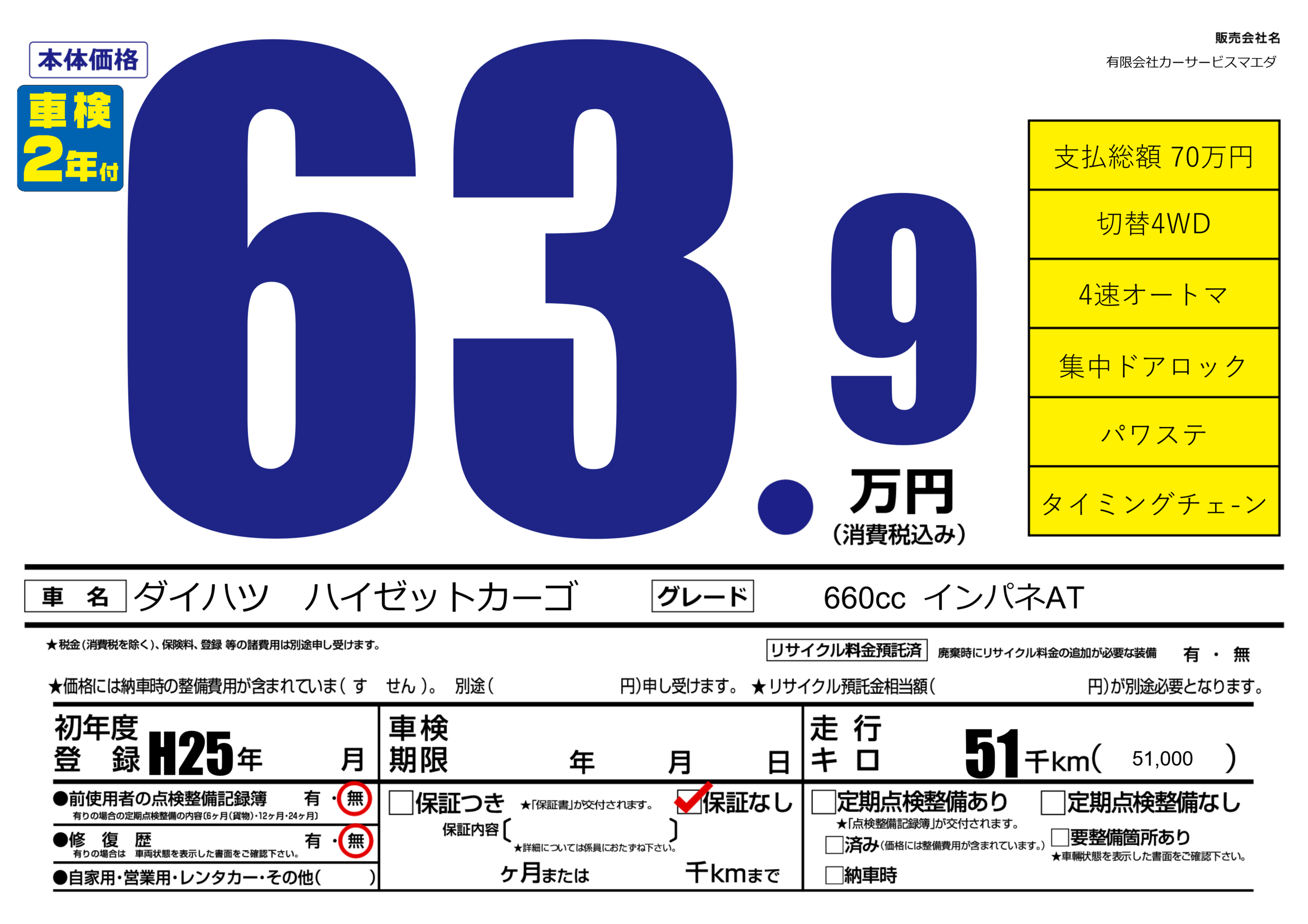 | 車名 | ダイハツ ハイゼットカーゴ | グレード ミッション 排気量 |