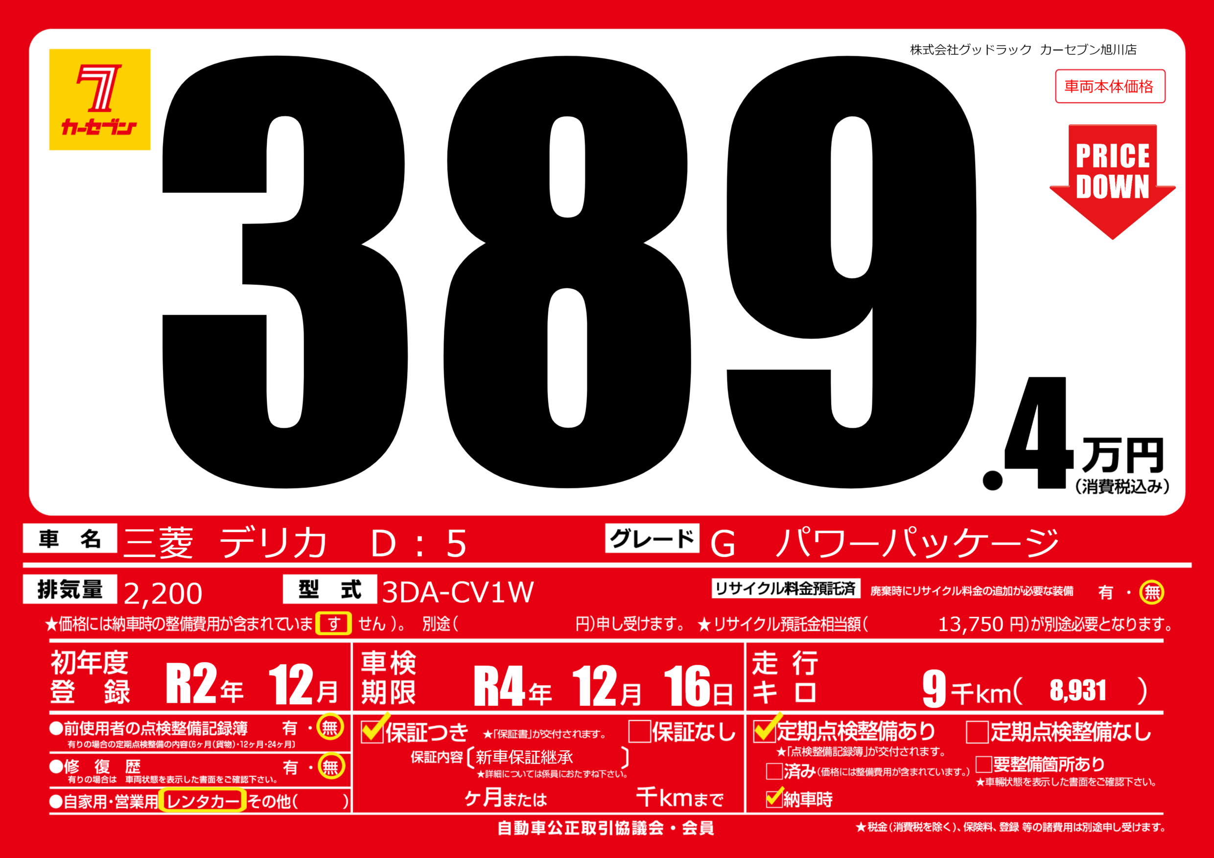 | 車名 | 三菱 デリカ D:5 | グレード ミッション 排気量 |