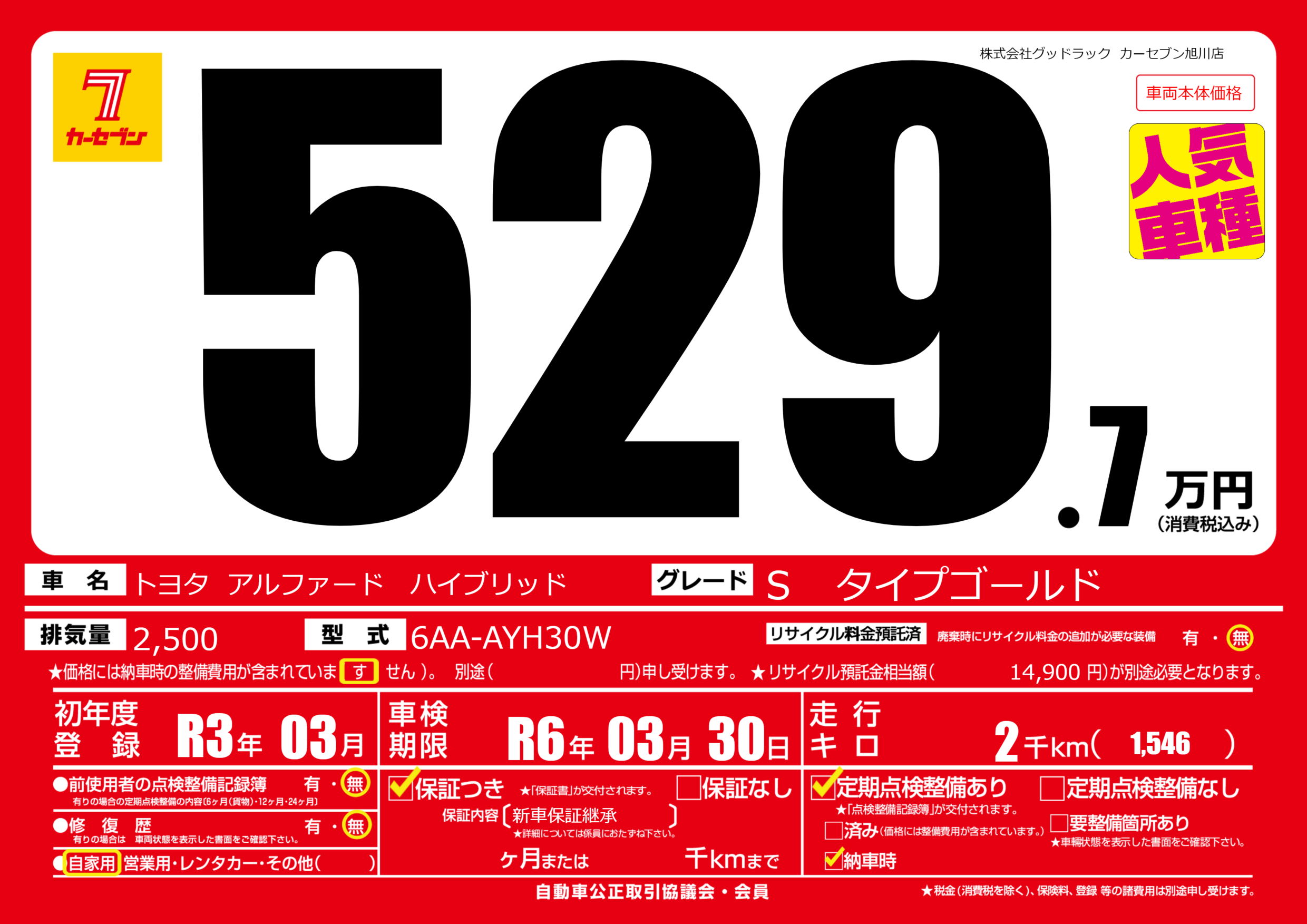 | 車名 | トヨタ アルファード ハイブリッド | グレード ミッション 排気量 |