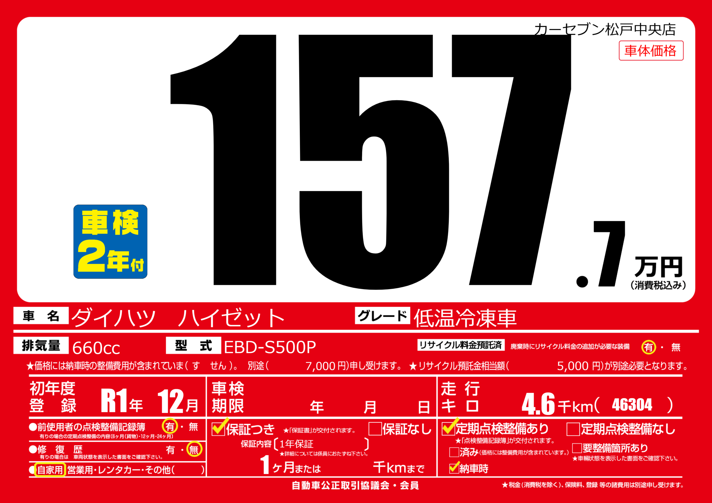 | 車名 | ダイハツ ハイゼット | グレード ミッション 排気量 |