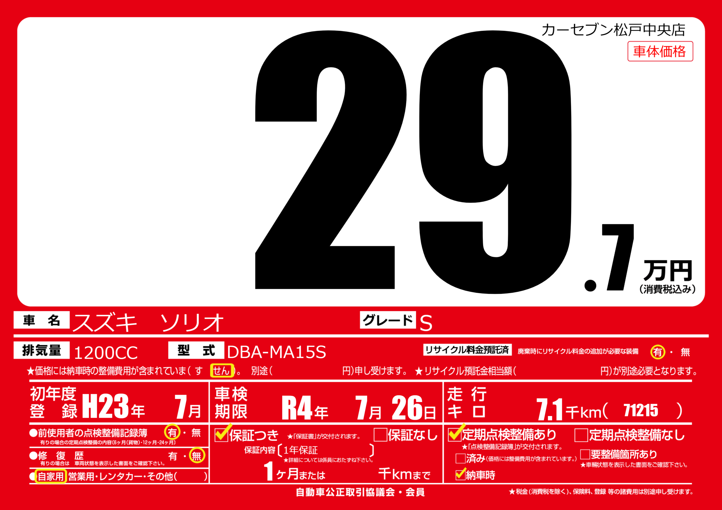 | 走行キロ | 0.7万km | 初年度登録 | H23年7月 |