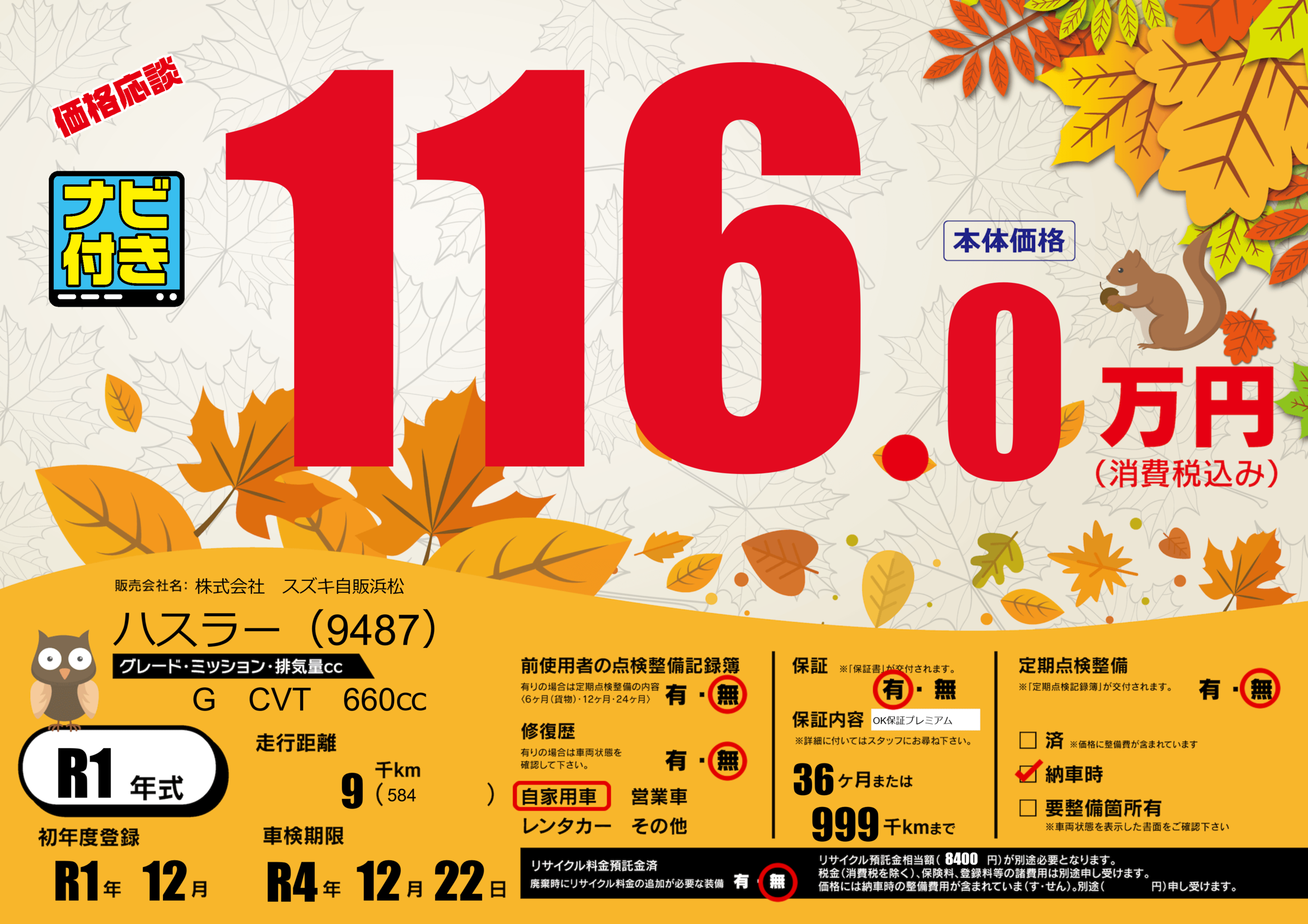 | 車名 | ハスラー(9487) | グレード ミッション 排気量 |