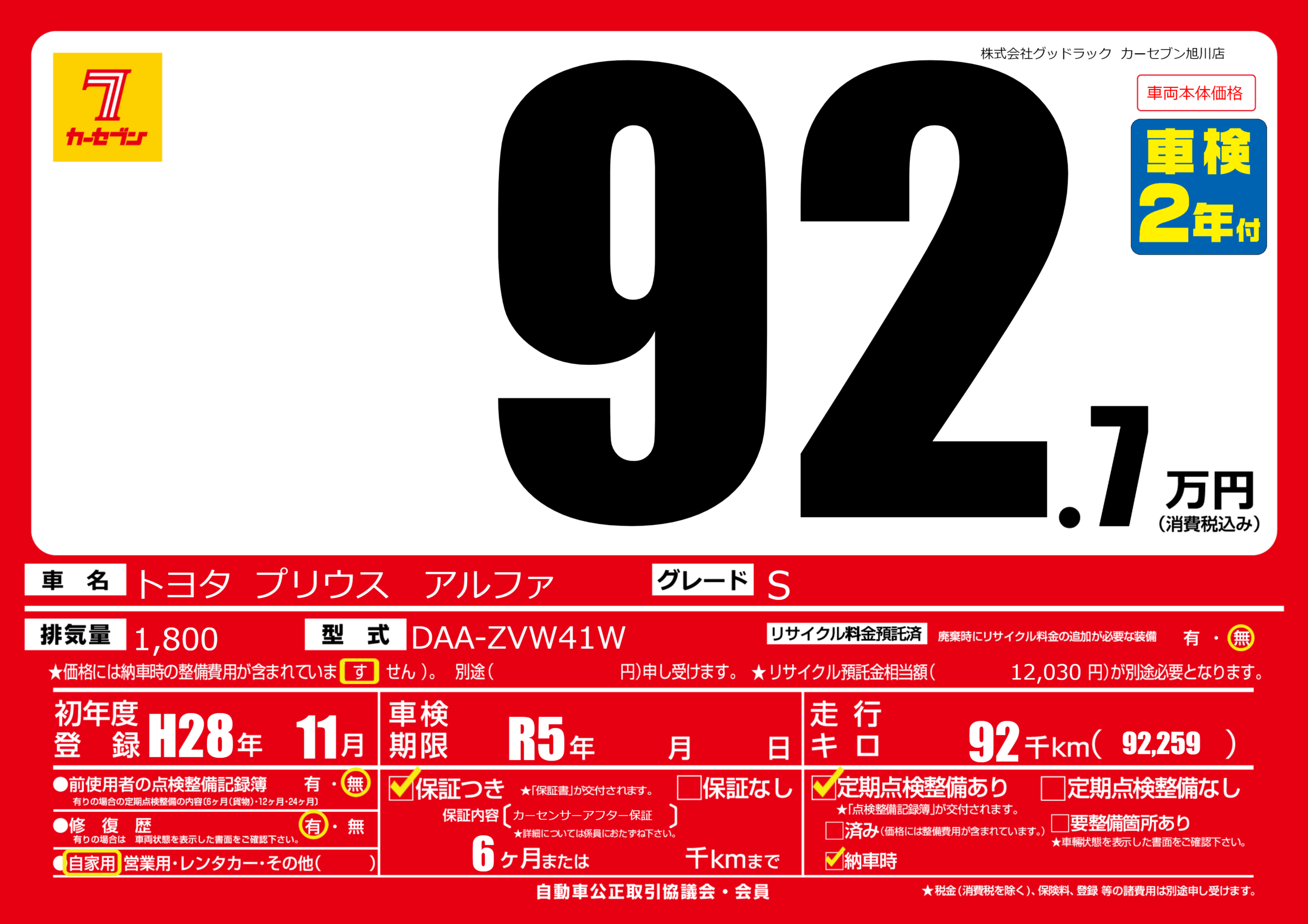 | 走行キロ | 9.2万km | 初年度登録 | H28年11月 |
