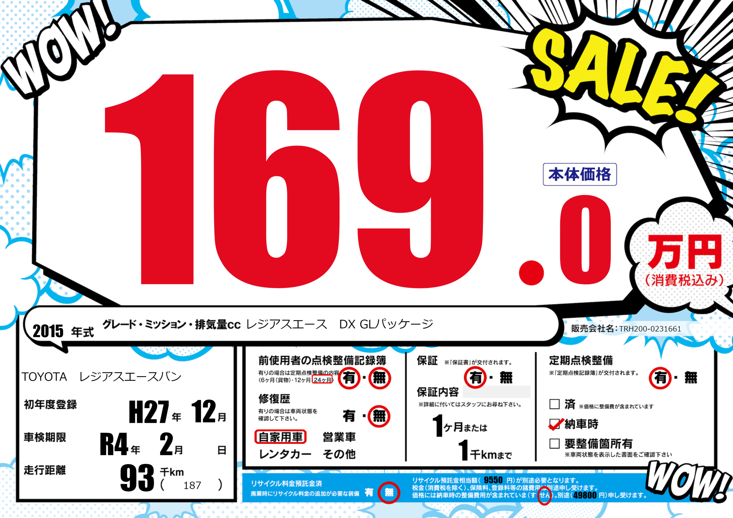 | 車名 | TOYOTA レジアスエースバン | グレード ミッション 排気量 |