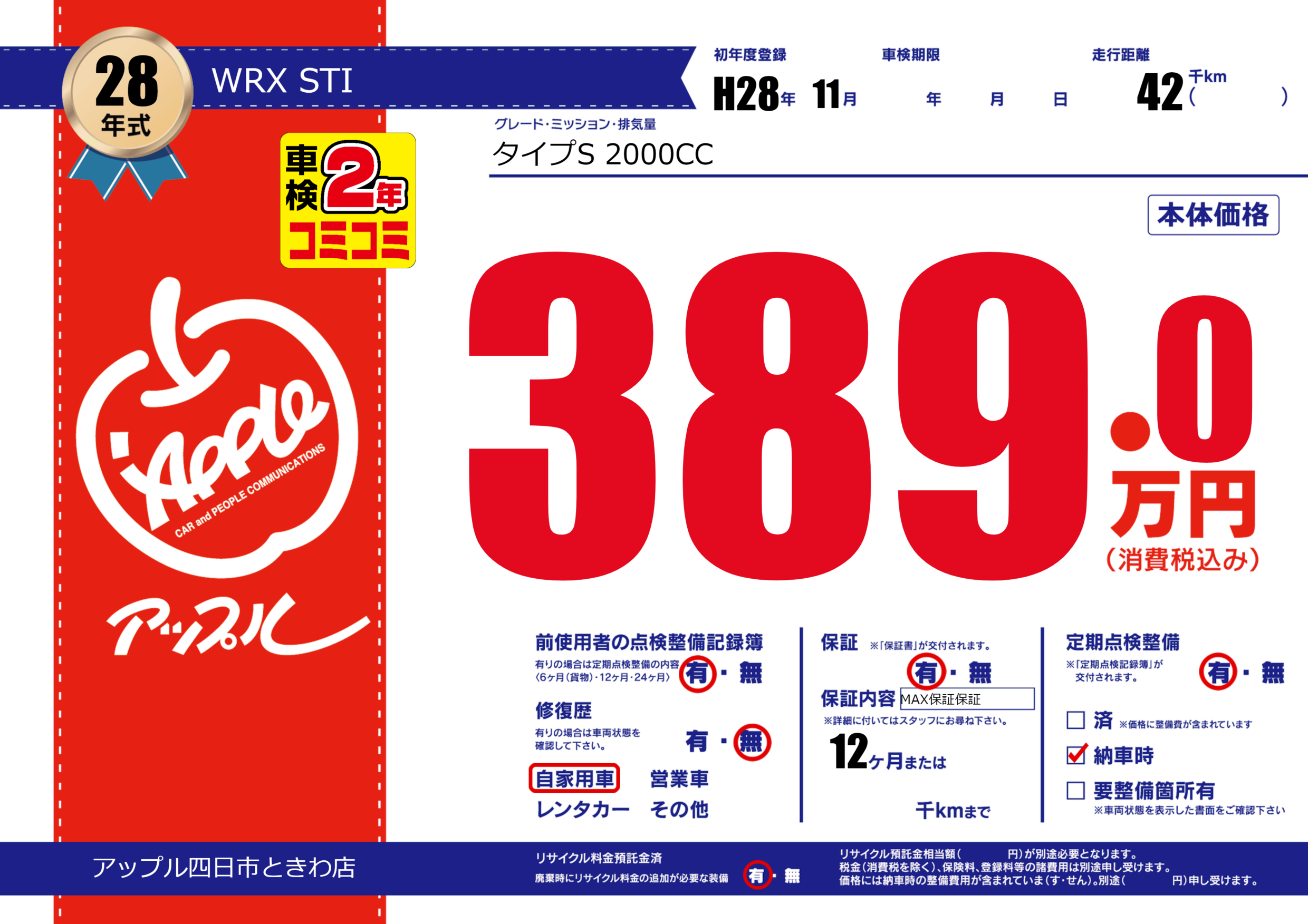 保証付き 保証内容(MAX保証保証) 12ヶ月または千km |