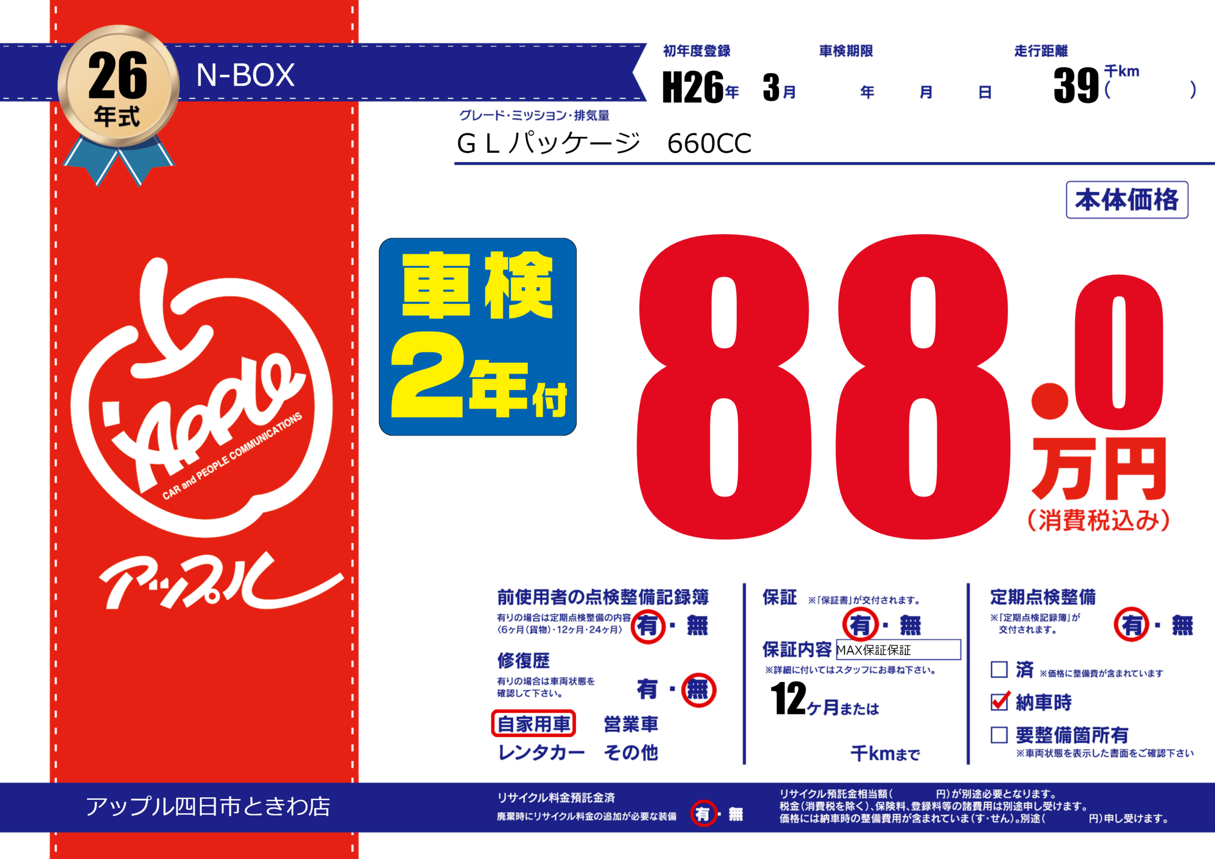 | 走行キロ | 3.9万km | 初年度登録 | H26年3月 |
