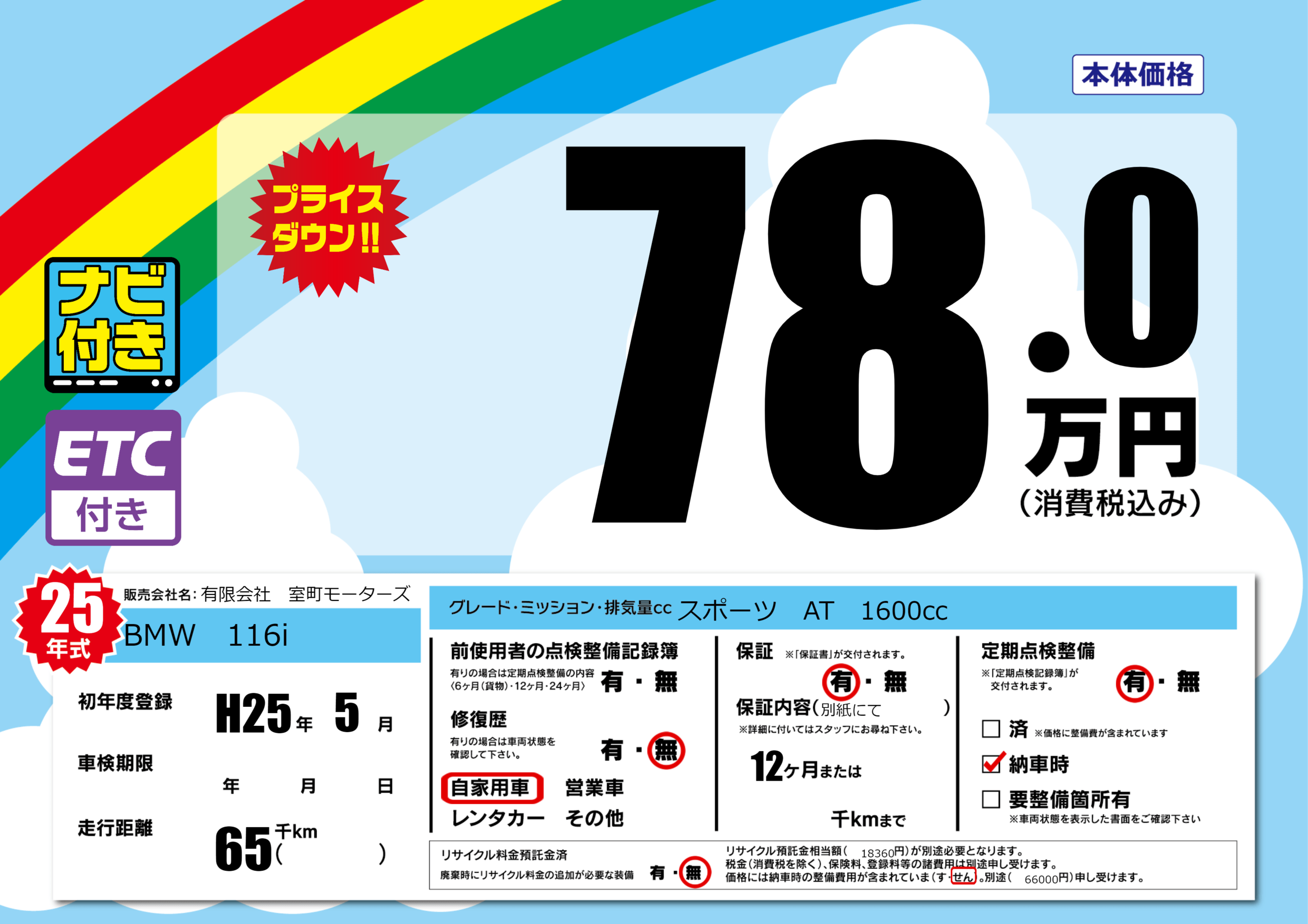 | 車名 | BMW 116i | グレード ミッション 排気量 |
